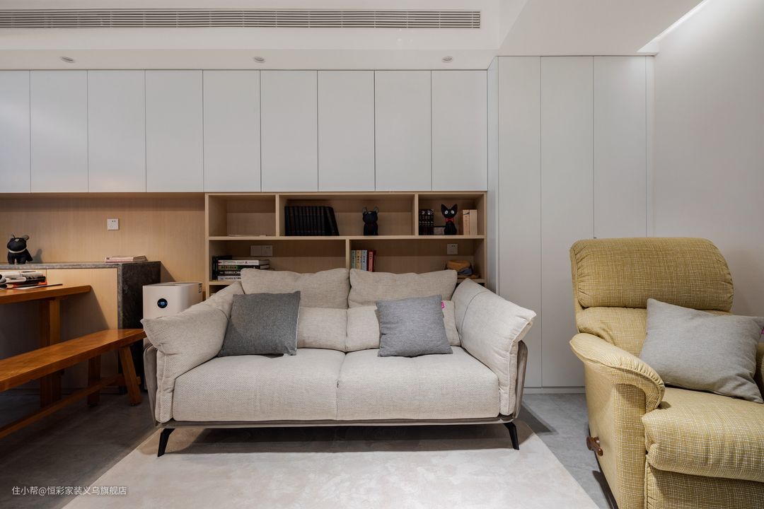 选择白色的柜门,对于没有采光的客餐厅来说,其颜色本身有不错的反光效果,能让空间显得更为清爽、明朗。同时足够的储物柜,杂物也有了好的去处,空间干净又整洁。 客厅的采光问题,是以筒灯作为主照明,配合灯光带布置,提升了整体的光感。