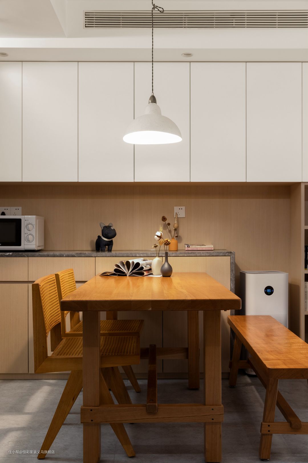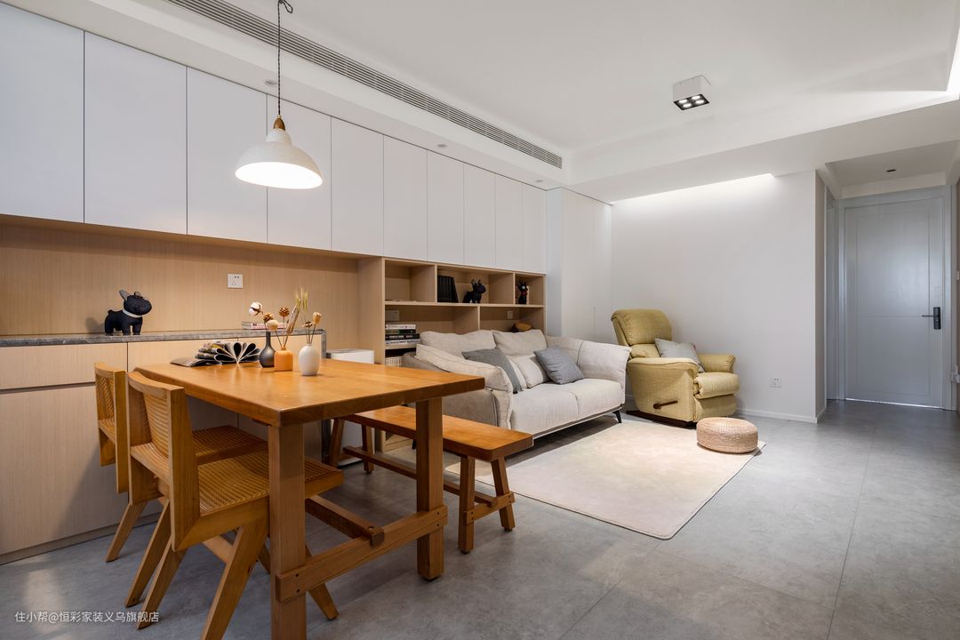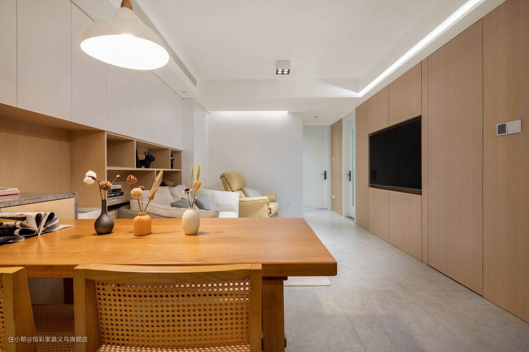 餐桌的颜色非常暖,木纹清晰细腻,结构稳定,占据承重优势。餐边柜做了置物台的设计,用石材包边方便家电及其他物品的放置。 木制天生自带的暖调,对于氛围的渲染很有一手;选择暖光餐厅灯,用餐区呈现的是一个非常温馨的格调。客餐厅以整面式的柜体做了空间的延续。