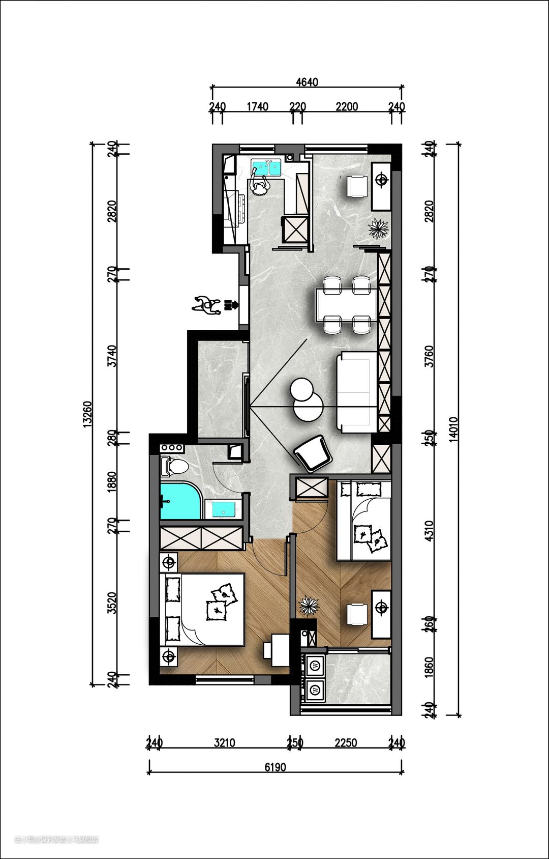 本案原户型最初的感受是空间比例非常奇怪,存在门对门、客厅采光很差且空间利用率低等问题。 因为面积仅75㎡,各空间实用面积很有限,房子作为业主家的刚需房在设计上会更偏向于实用性。除了增加空间的利用率,再者就是调整空间比例,使之更为宜居、舒适。