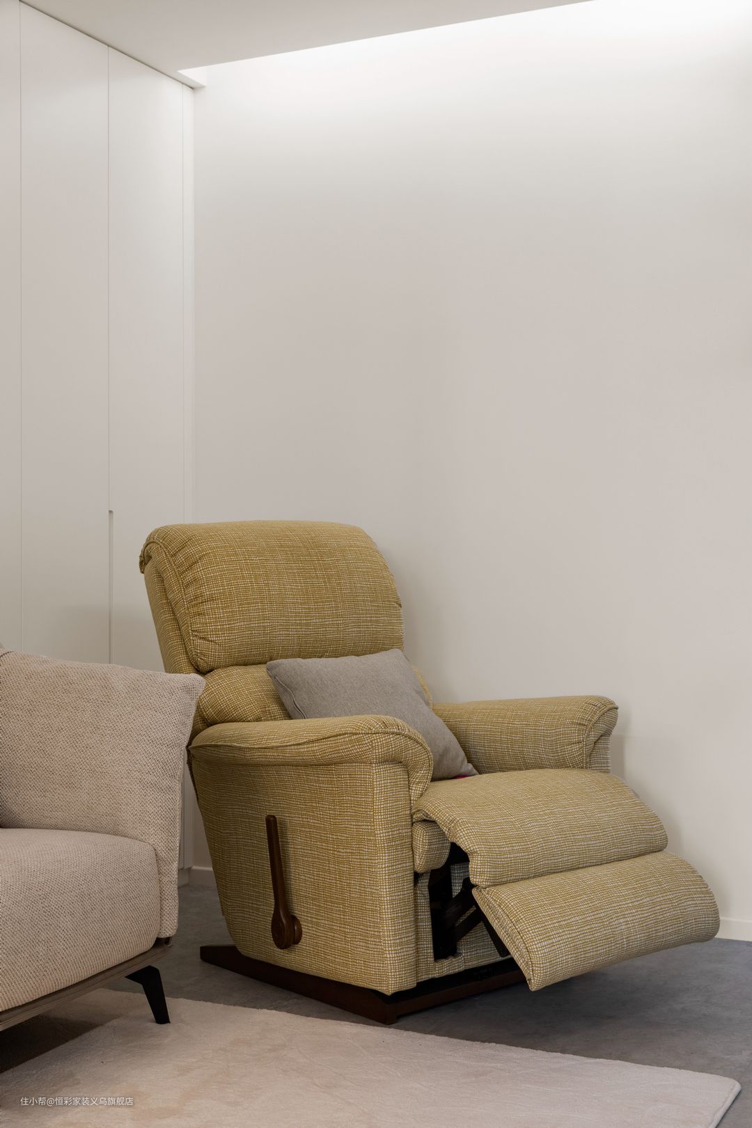 靠墙[LAZBOY乐至宝]沙发单椅,正坐、斜靠两种形式可按需选择。挑选的是[春晓]的款式,与空间整个的色调非常协调。柔和的灯光带,让这一隅更为惬意。