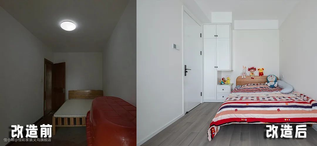 主卧门洞作了小改动,为儿童房的改造留出空间。优势在于窗户提供了不错的采光,虽面积仅11㎡,但整体的空间感非常不错。 改造前: 可能因为空间不大,选择了较小的床铺,更显得局促,空间完全没有美感。 改造后: 床铺尺寸翻倍,更为大气,硬装虽简单但是空间重心立显。
