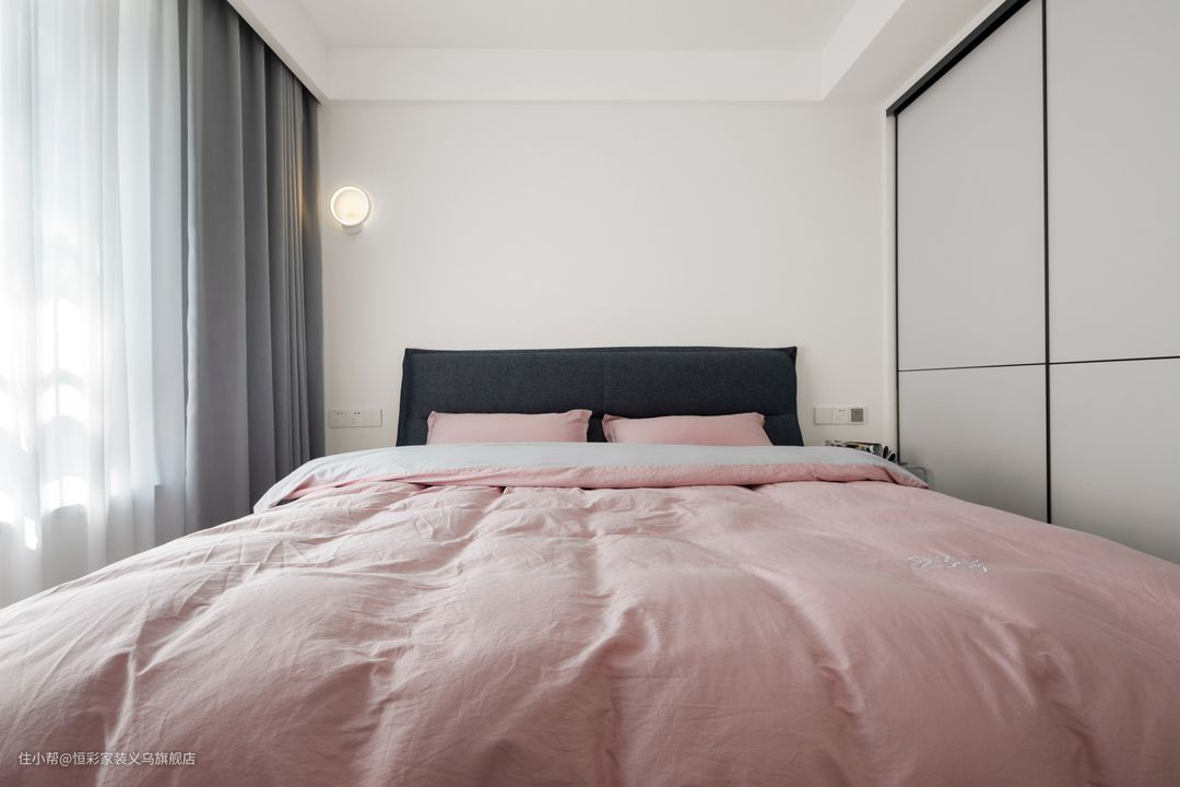 留白的墙面单侧壁灯,照明更兼装饰效果。虽卧室布局简单,但在去掉繁琐之后更有一种天然的美。 粉灰的颜色搭配非常高级,软装布置提供居家的安适与恬意。