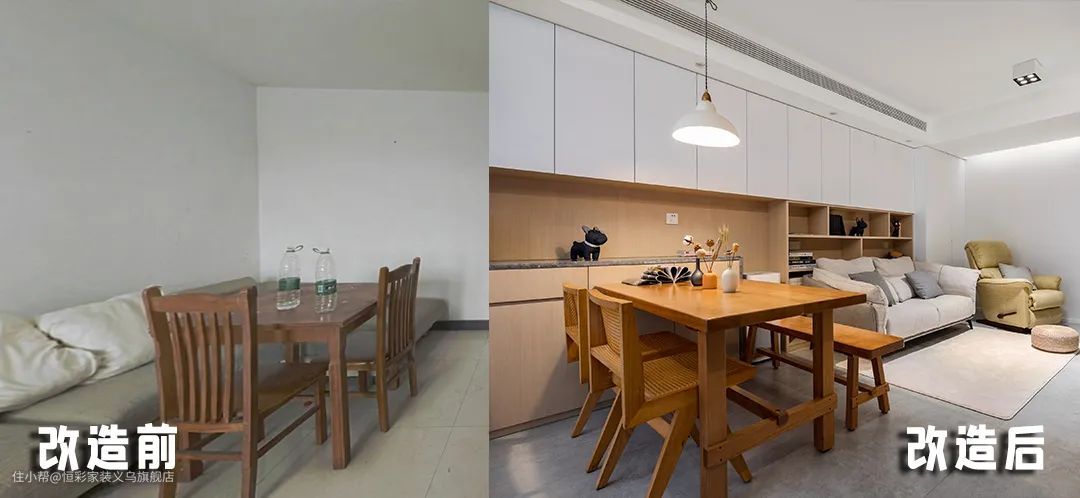 改造前: 客厅正对的小空间面积不大,采光较差,存在空间浪费。 改造后: 设计隔墙作为电视机背景墙,做隐形门暗藏储物间。