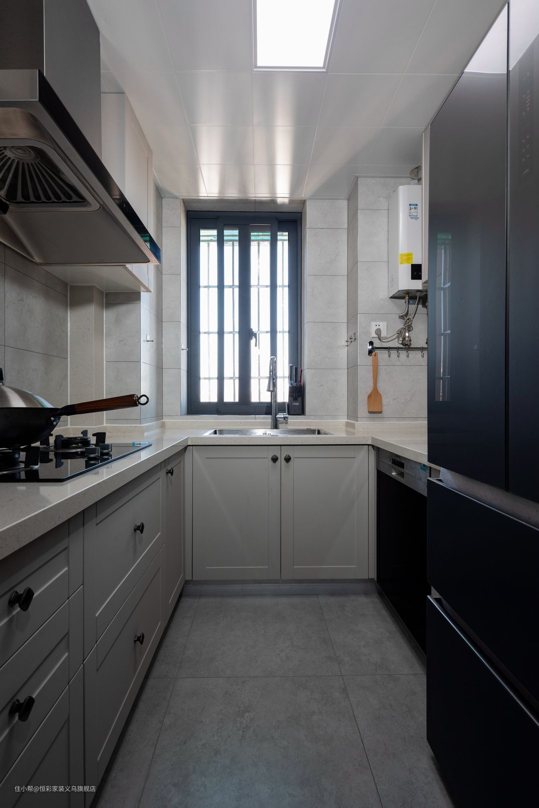 黑白灰色调的厨房,非常简洁大气。洗碗机嵌入柜体内,可保留充分的台面供操作。除了柜体的布局,墙面挂钩充分利用留空的区域。