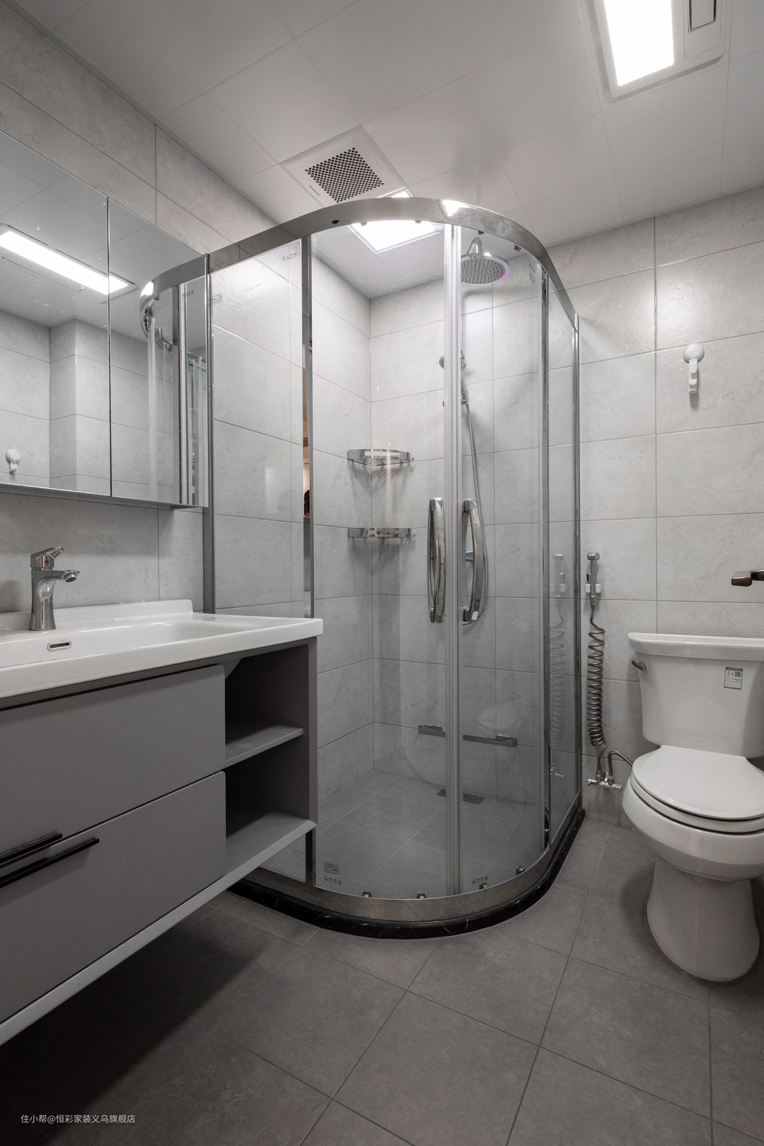一体式的格局,镜柜、淋浴区、如厕区都有好的位置,让卫生间更为规整有序。马桶自带喷枪,方便表面污渍的清洗,是非常人性化的小设计~