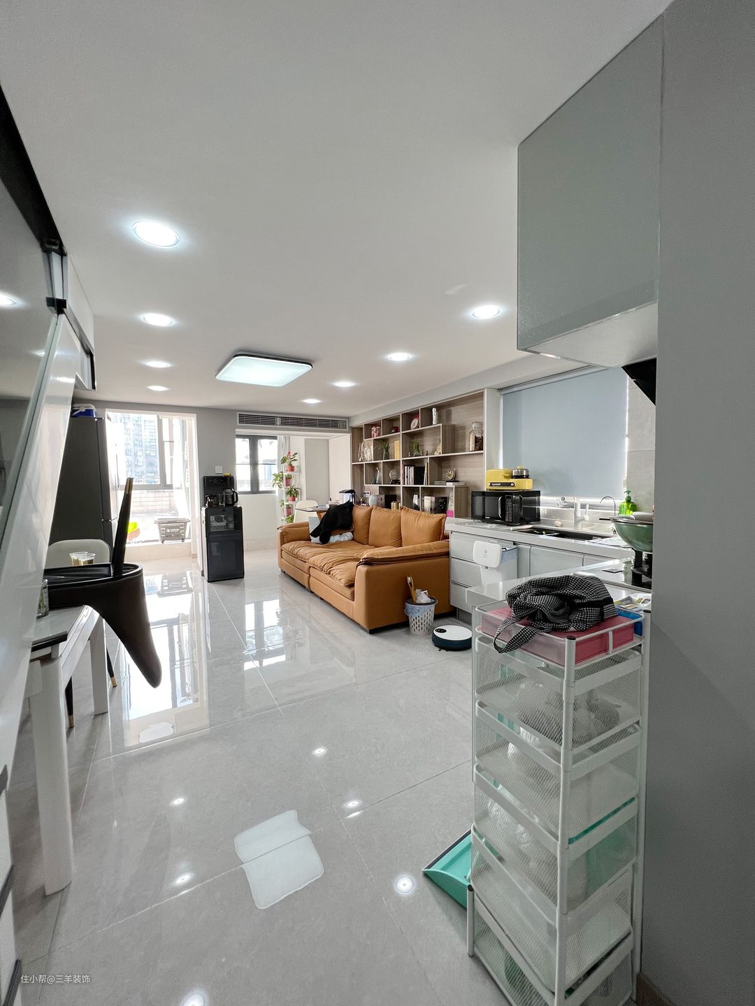 然后玄关进来就是一个开放式的大空间,包括了客厅、餐厅、厨房~而且整个空间的配色也都是以简约、清新的格调进行装饰的,白墙和灰白色的地面连成一体,在视觉上起到放大作用,这样的设计很常见于小户型。