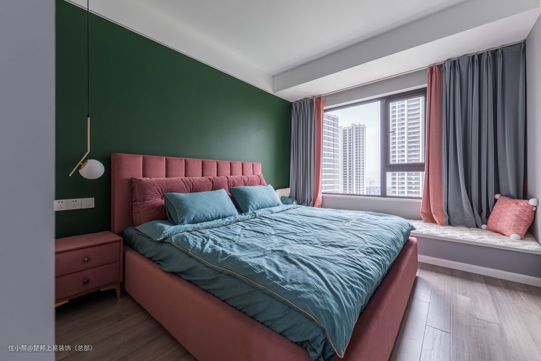 卧室整体选用红绿撞色,利用高明度,高纯度的色彩打造视觉冲击力。
