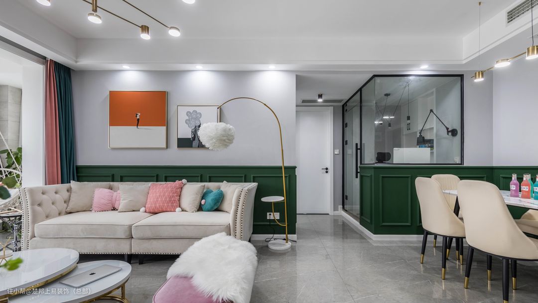 沙发背景墙搭配富有艺术感的挂画,让客厅拥有了一丝时尚轻奢感。