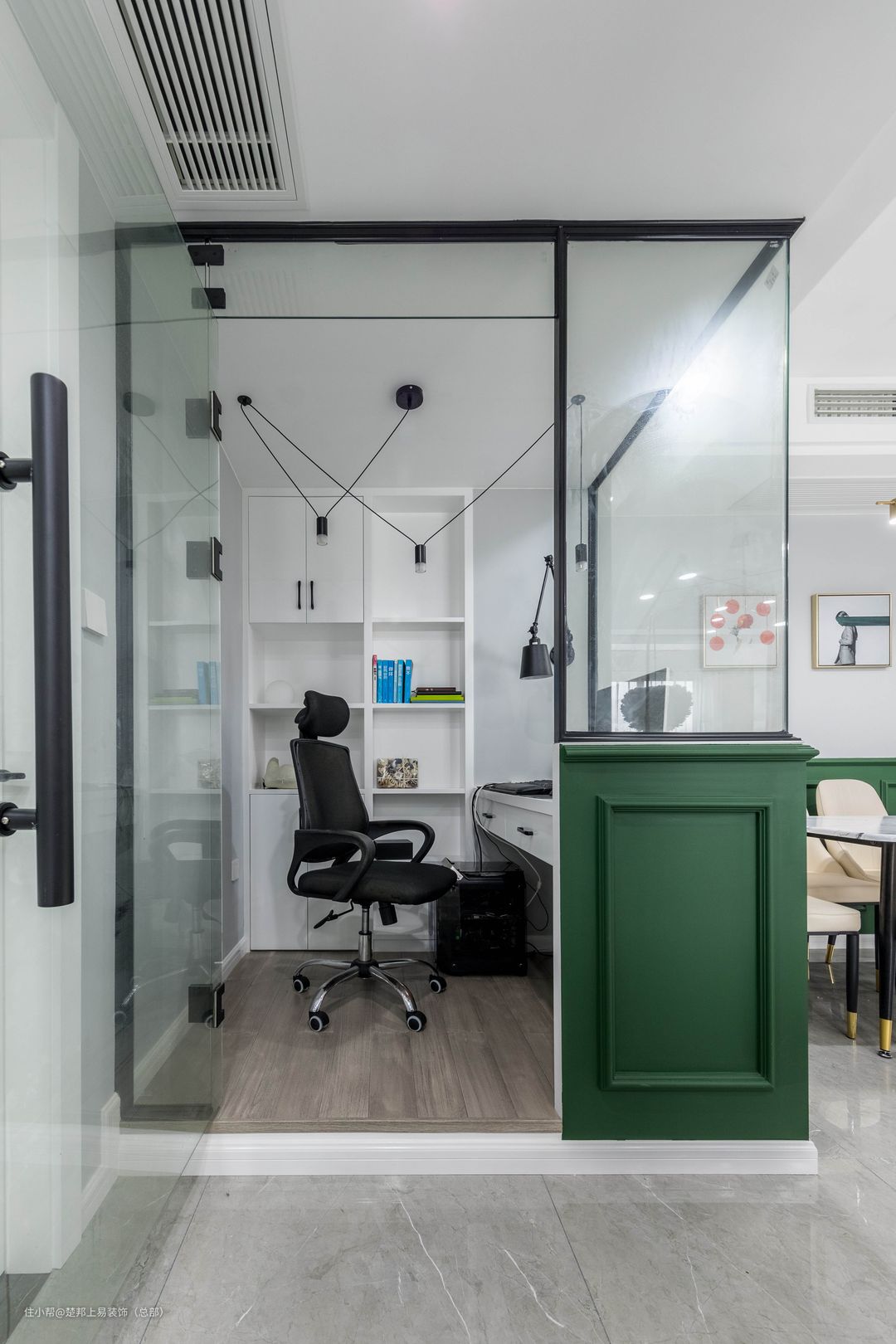 在餐厅一侧区域打造一个书房,整体使用黑白配色,高级感十足,而且更时尚大气。