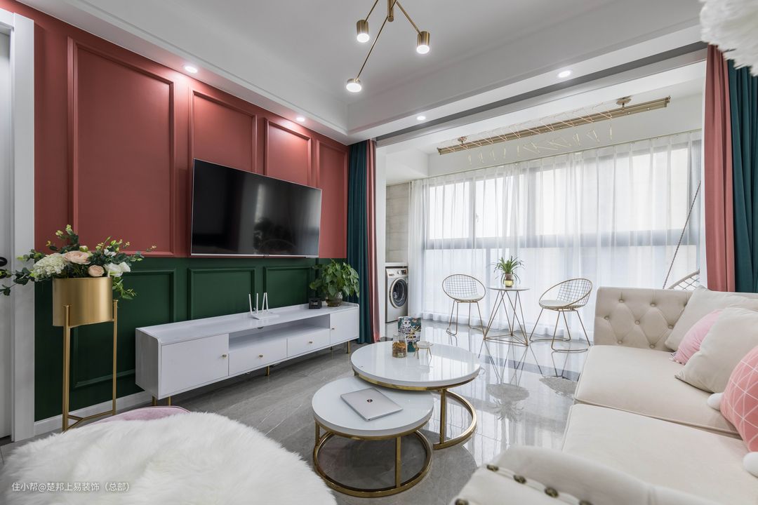 电视背景墙则打造一种法式复古风,巧妙利用石膏线走边 ,豆沙粉搭配浅墨绿复古清新。