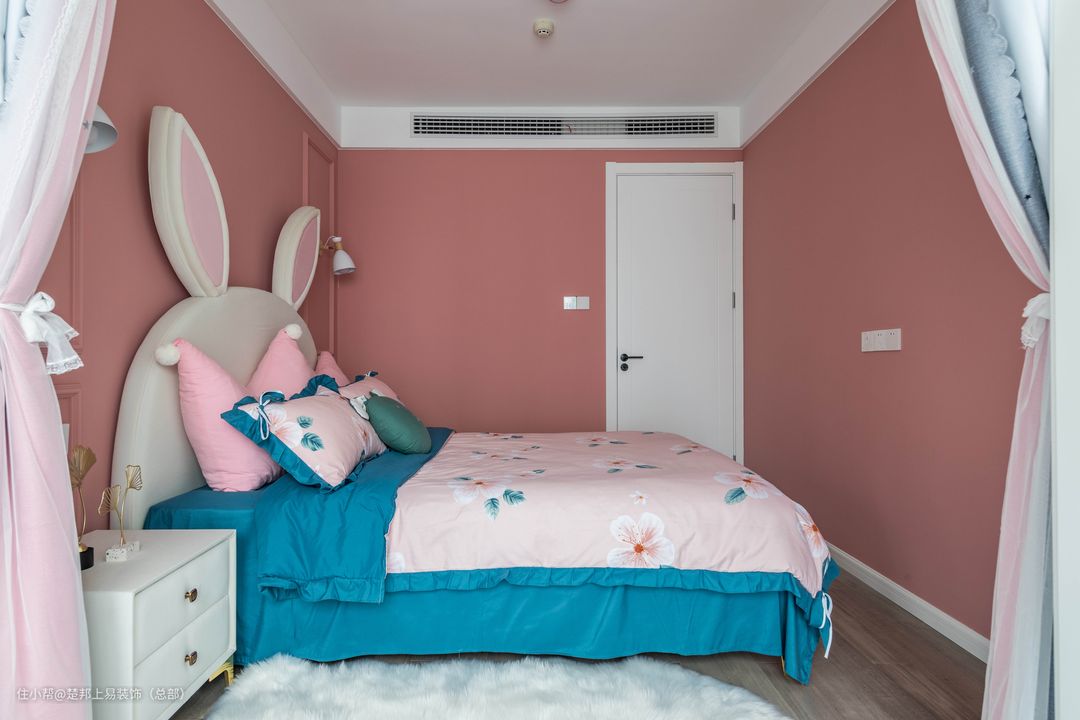 藕粉色乳胶漆搭配石膏走边,使整体更立体感不在单调。兔耳朵大床+简约小壁灯, 梦幻满屋都是粉红泡泡。