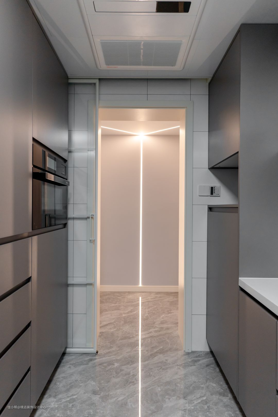 在厨房门口设计线形灯,与顶上的线形灯有个呼应,视觉效果更酷炫