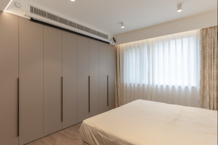 床尾是一整排的定制衣柜,利用衣柜面板的空间。在吊顶上方安装投影幕布,方便业主夫妻俩躺床上刷剧看电影。