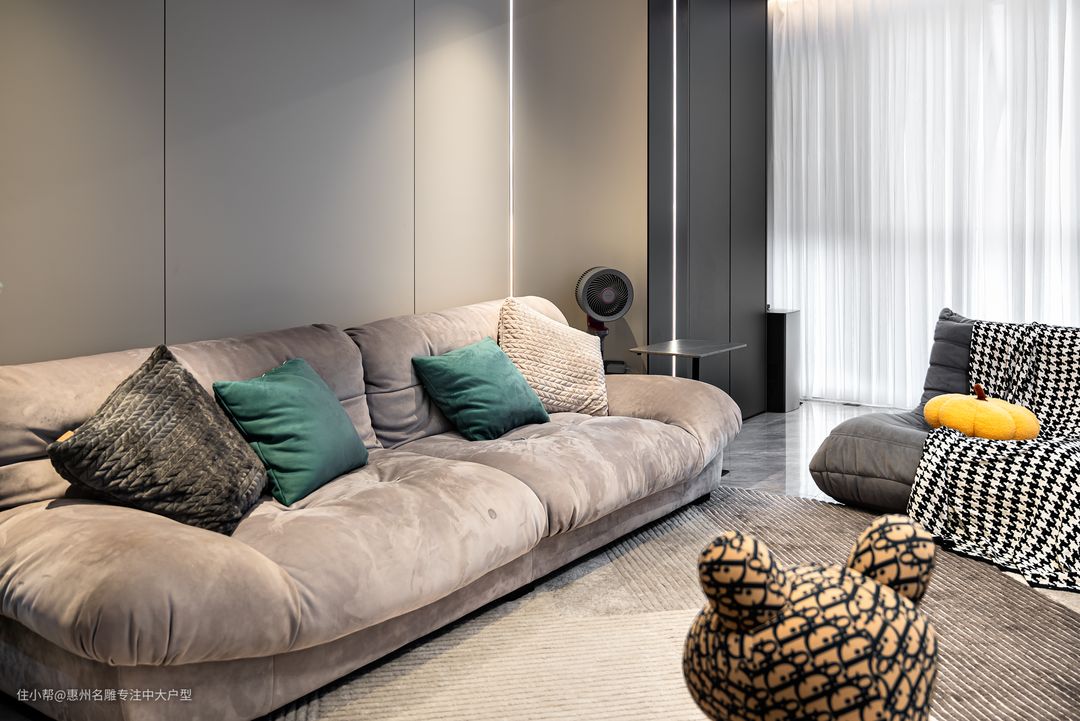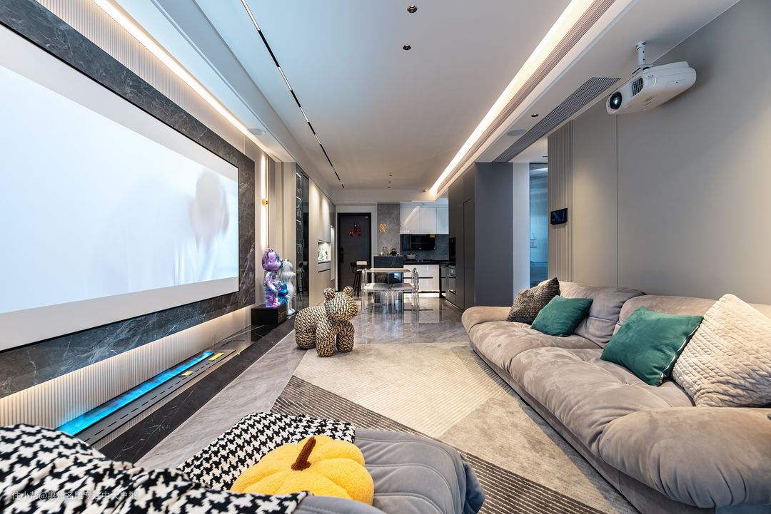 客厅隐藏式灯带的使用,即便客厅空间较小,巧妙且合理的布局后,不仅会让空间感到拥挤,还有尽显出灰色色调的高级感。