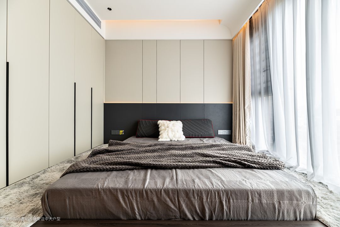 走入卧室,柔软的大床坐落,真正的放松和淡淡的倦意来袭,棉花轻柔地按摩着身体,连带着这一天最后一丝的疲惫也都卸去。主卧的设计延续空间的整体基调,落地窗、木质地板与线条简洁的隐藏式灯带相得益彰,构成了一幅纯粹而富有质感的空间环境。
