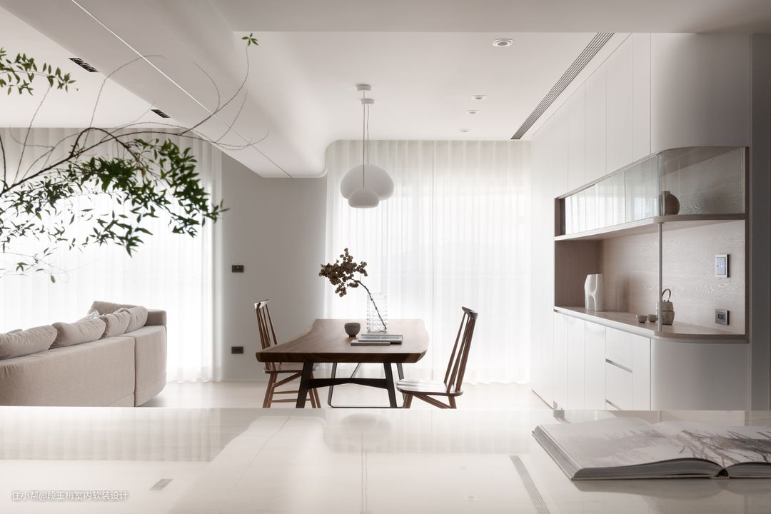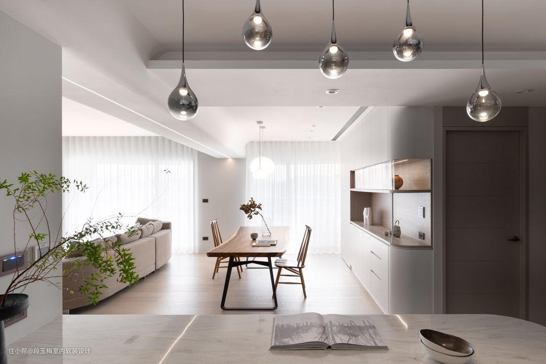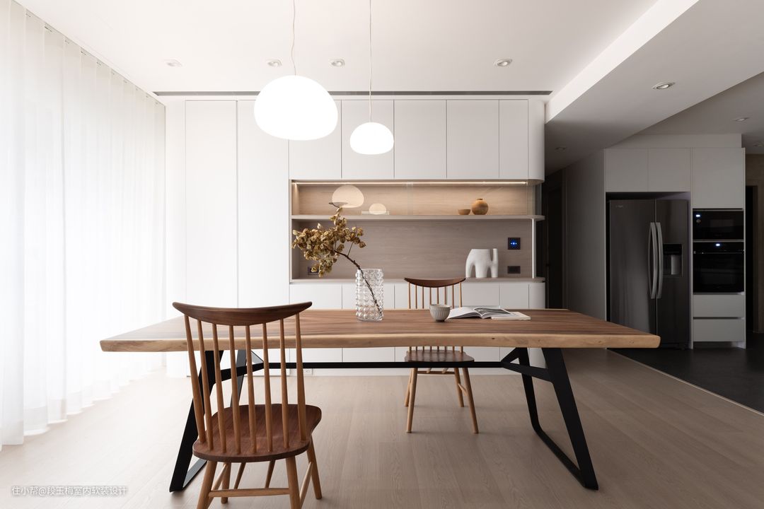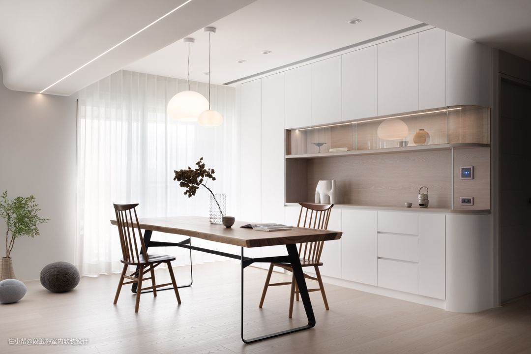 人性化设计:餐厅采用长条案餐桌,用餐、手工、学习、办公都可以。孩子可以和父母一起完成学习和手工活动。
