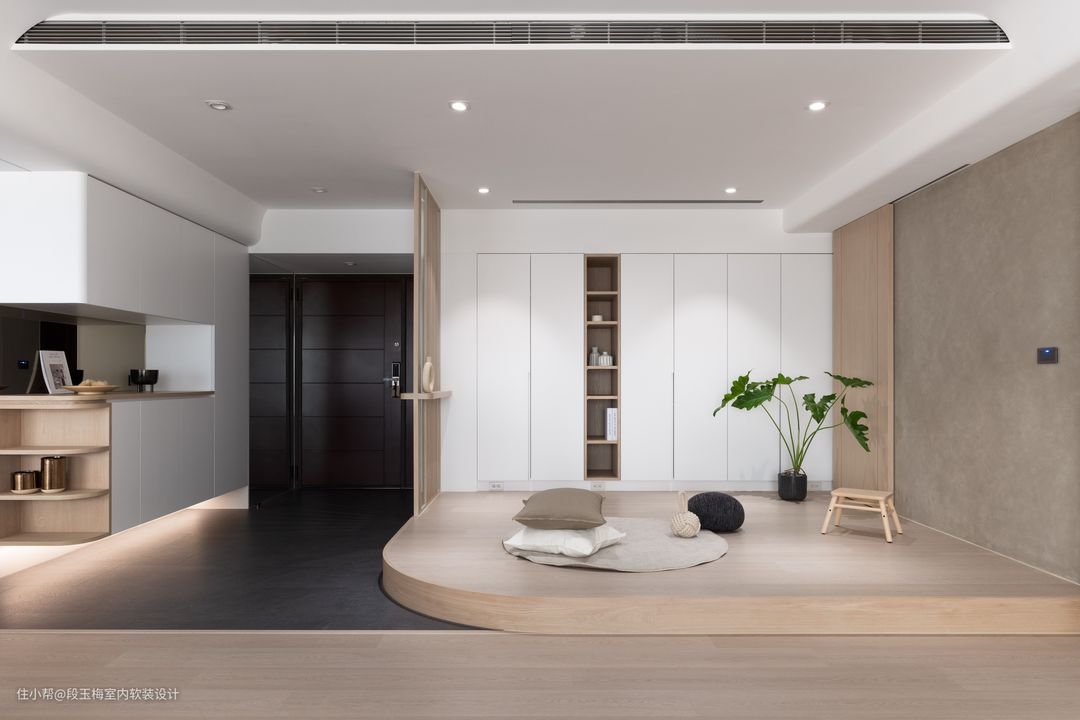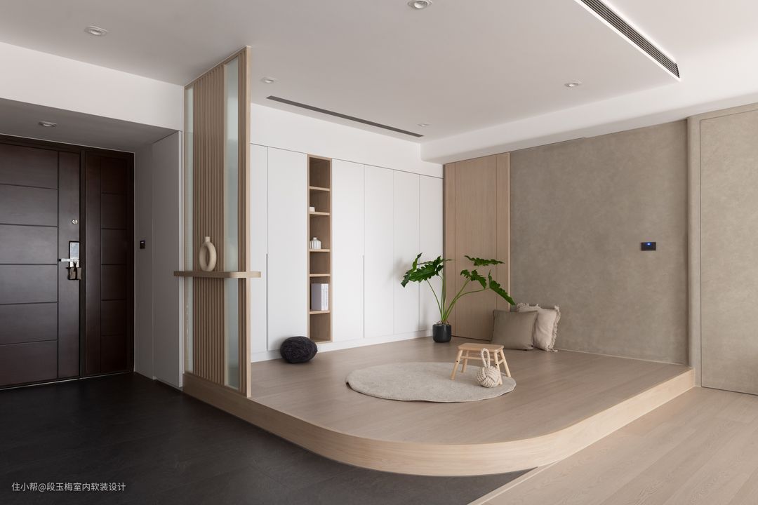 地面:玄关和厨房采用300X600mm深色地砖,地砖的特性是防尘防油污,非常适合这两个区域的特性。 柜体:200mm悬空+灯带的设计,便于拖鞋的储存,也正好将厨房包覆其中。 人性化设计:中间镂空部分设计了反光镜,起到空间延伸的作用。