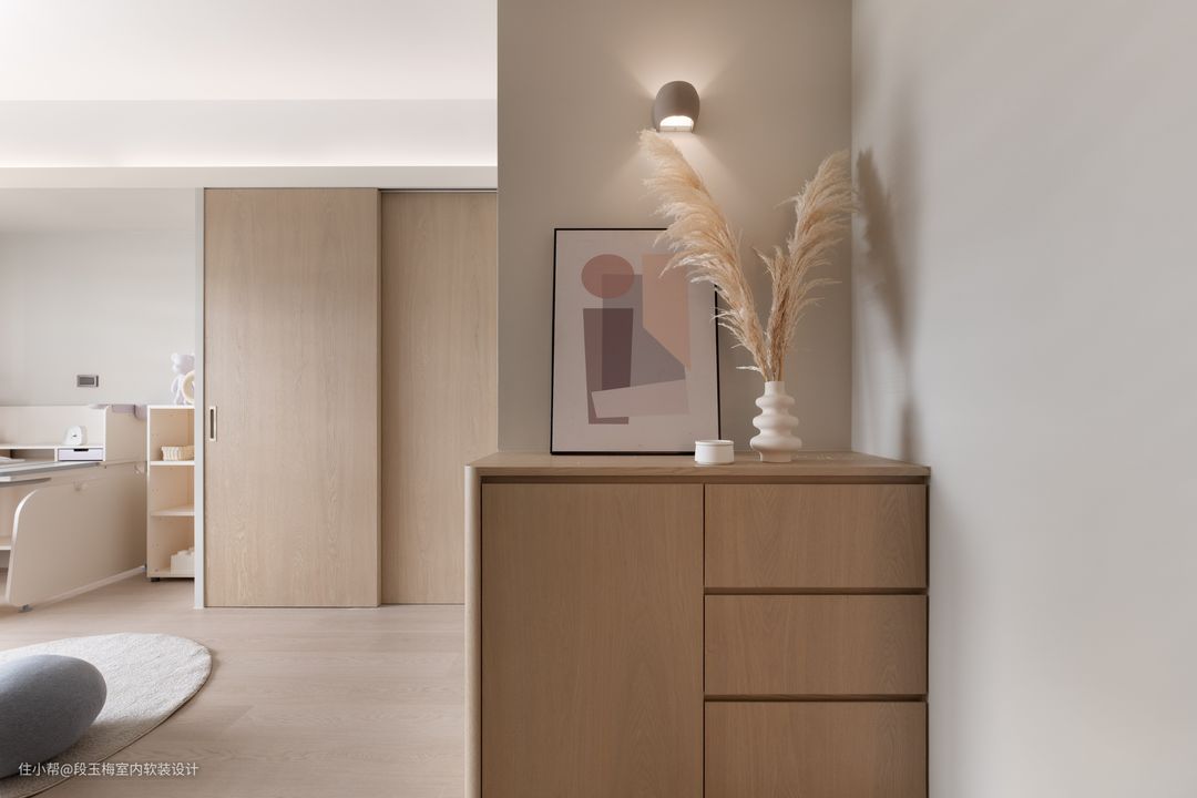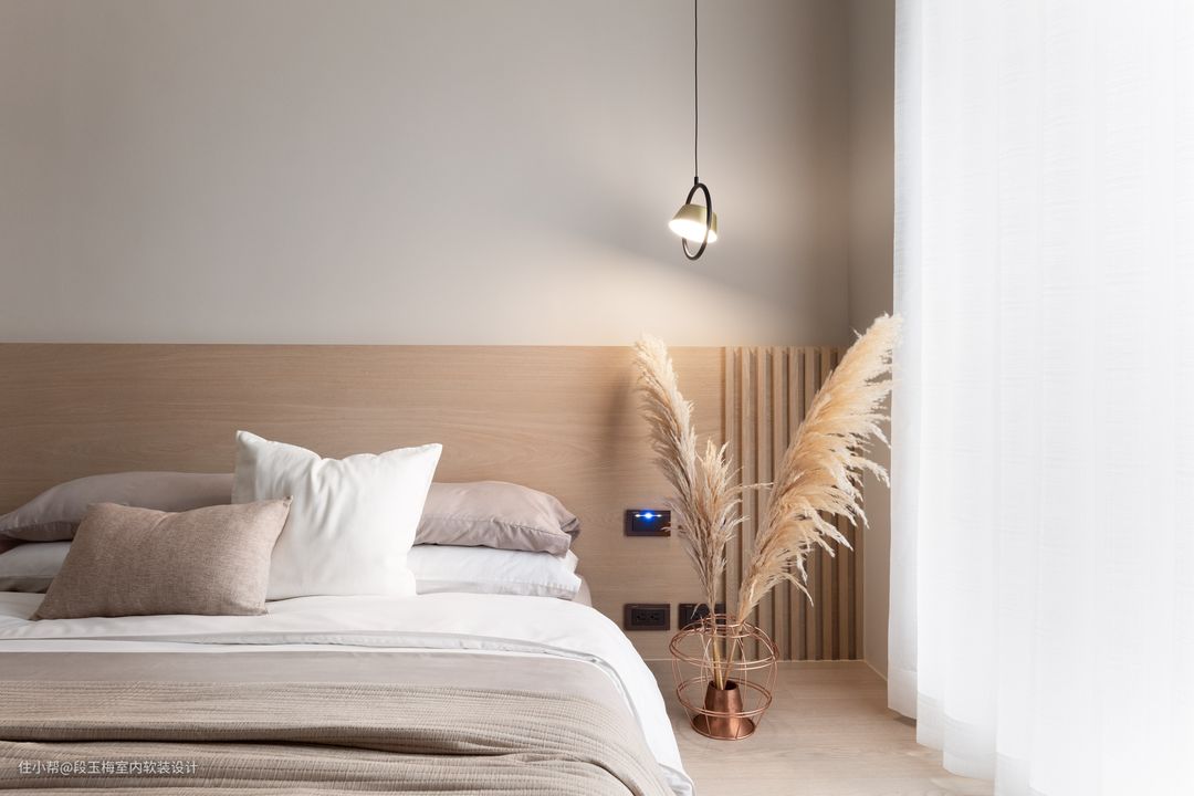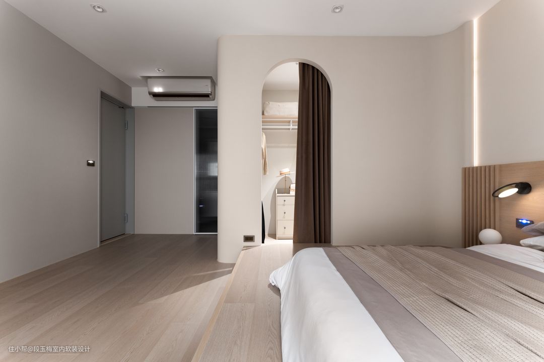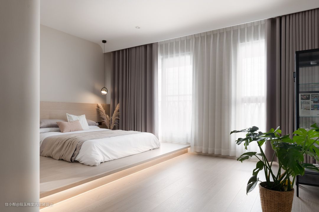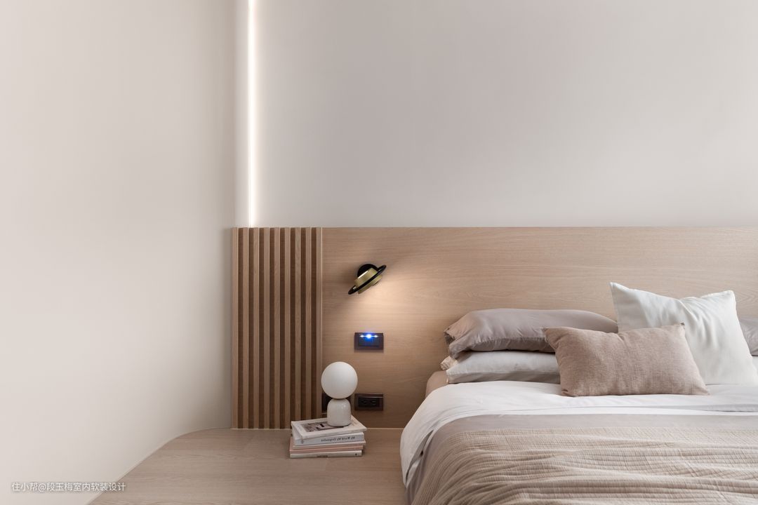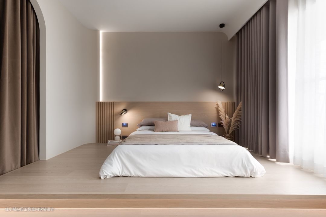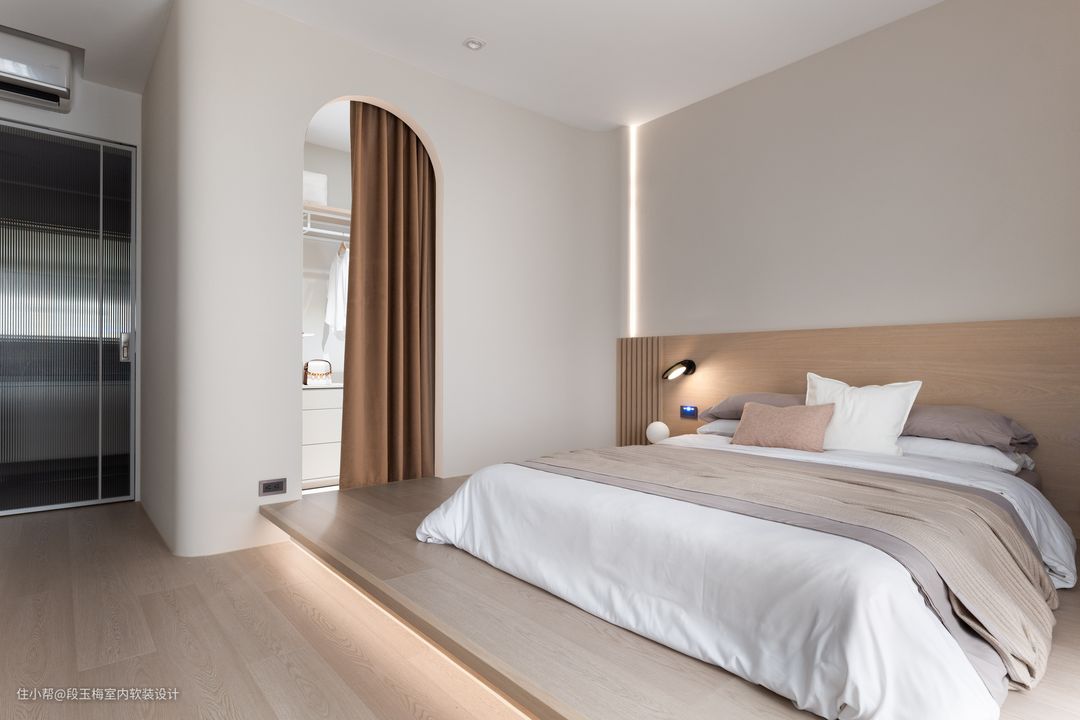 地面:主卧采用地台的形式,木质感十足,温暖舒适。 背景墙:无床头矮床设计,让生活变得更简约。 人性化设计:同样考虑小宝宝时常需要过来找父母,所以没有设计高窗,保障安全。