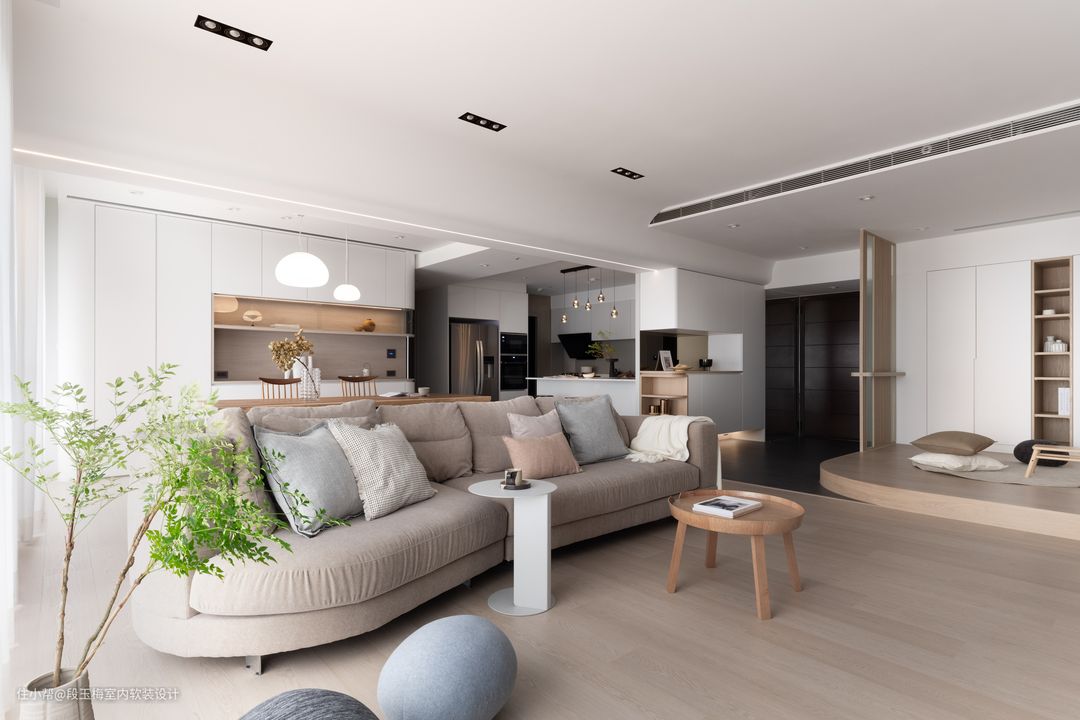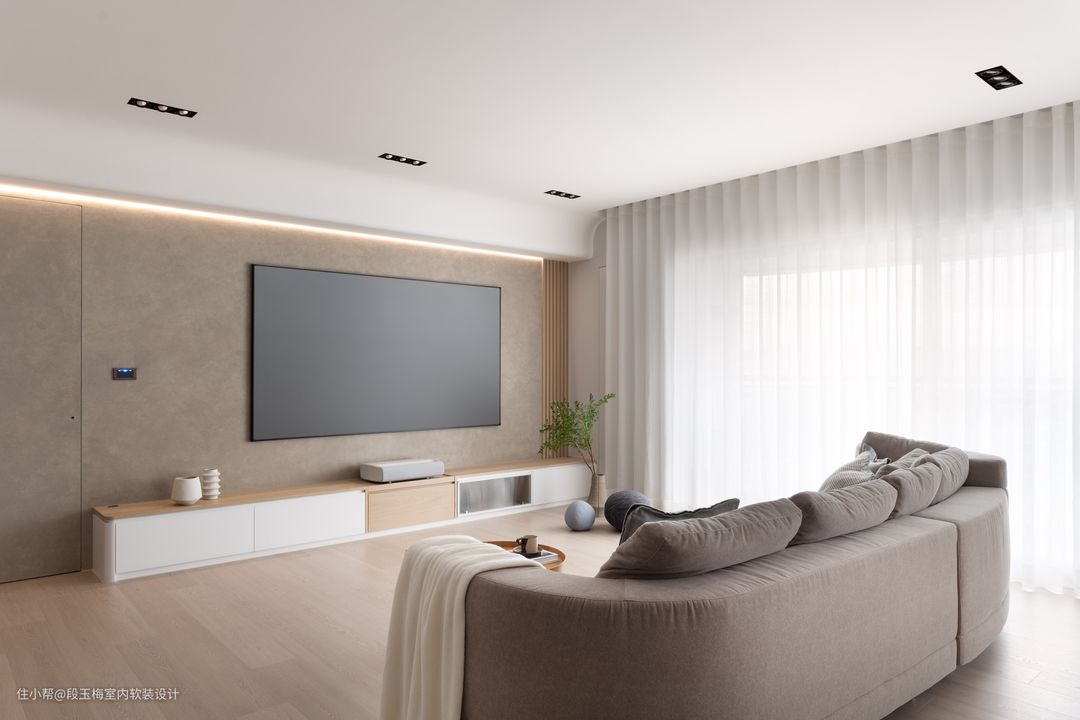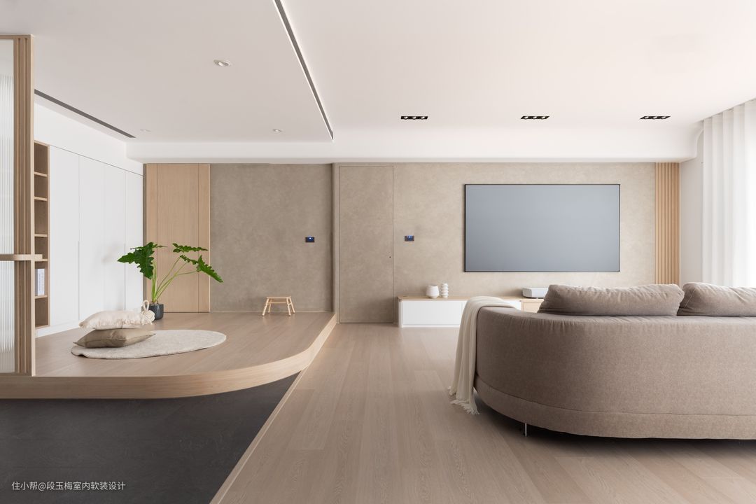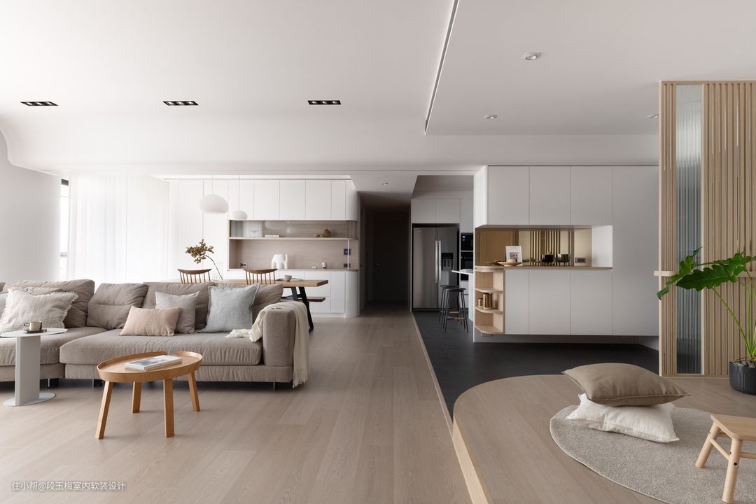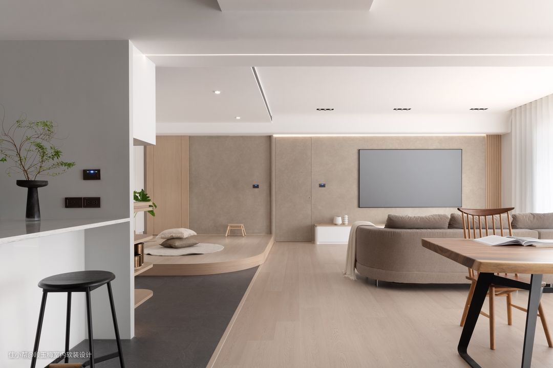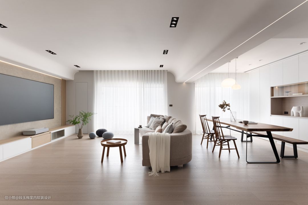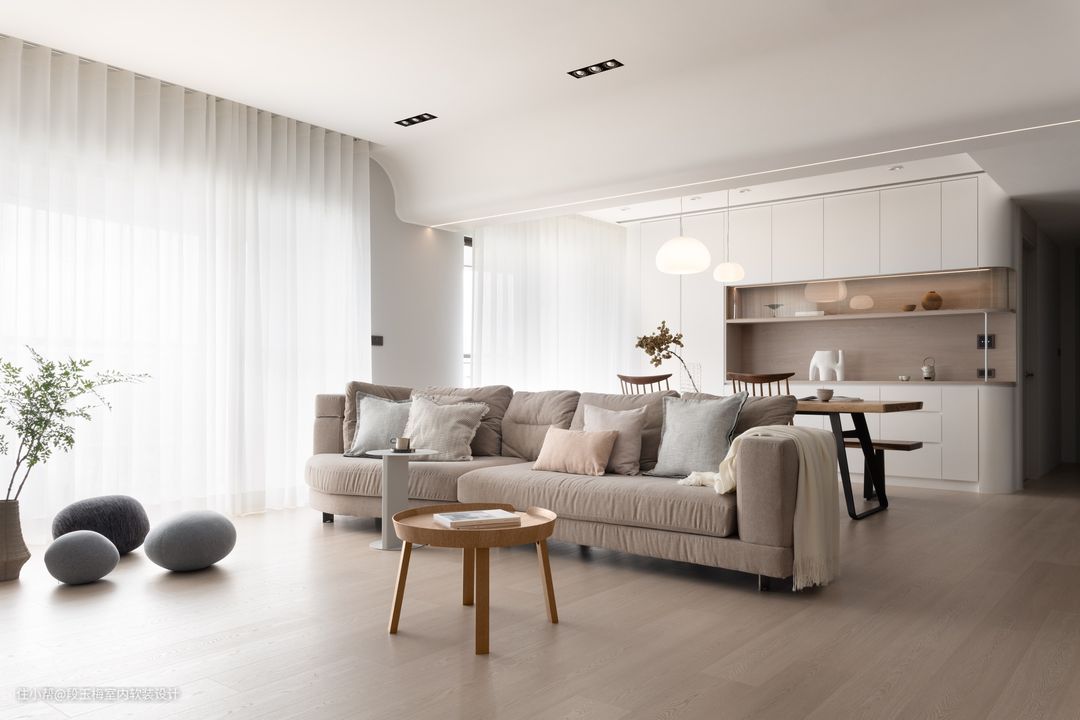 地面:采用369地板通铺,温润的质感便于孩子在上面活动。 吊顶:采用无主灯设计,简约明亮。 背景墙:电视背景墙采用清水砼,肌理感和花纹都非常的好看。 人性化设计:客厅采用无茶几设计,所有家具低矮还做了圆角处理,设计师时刻考虑孩子的成长。