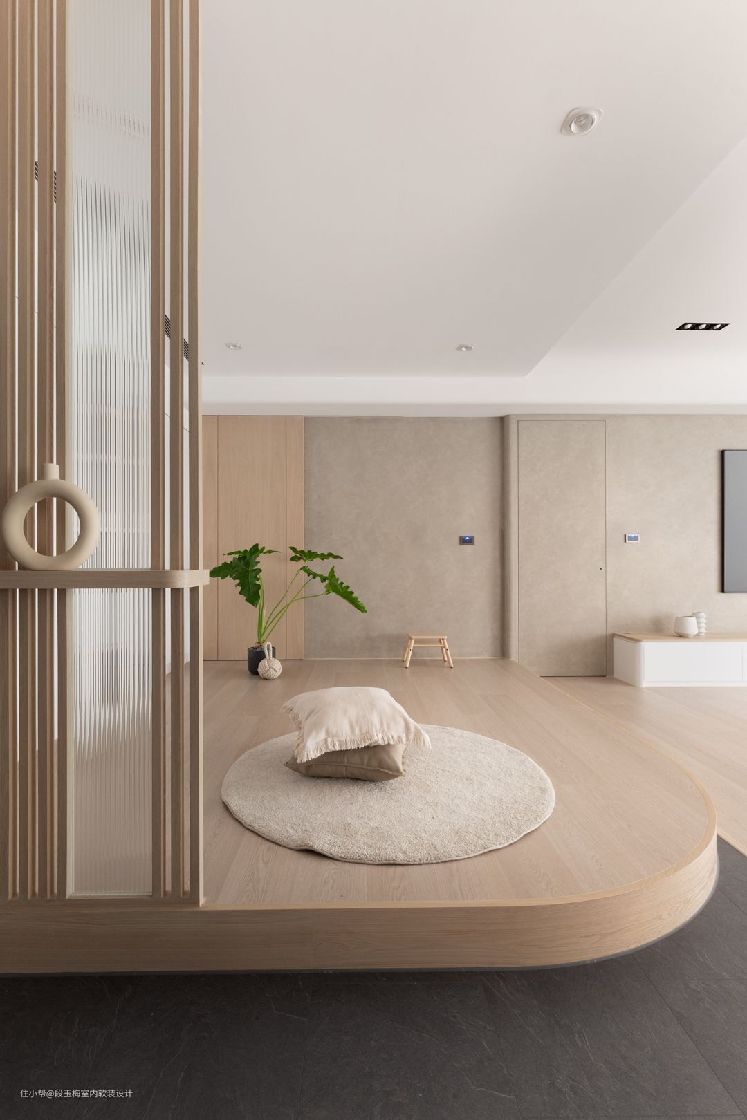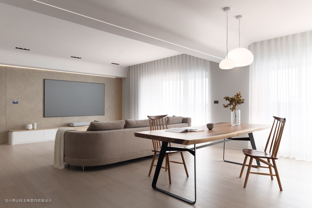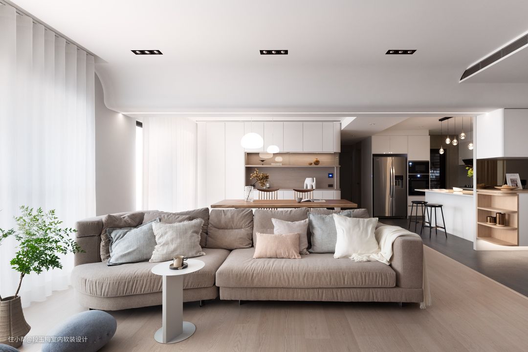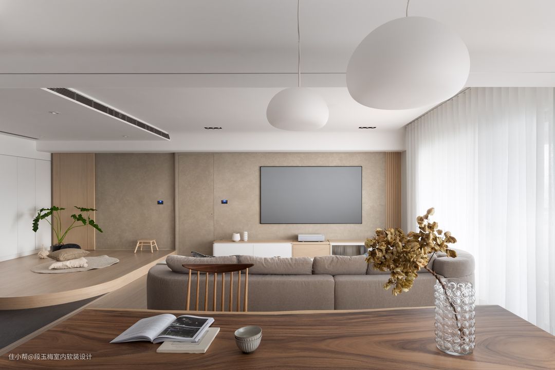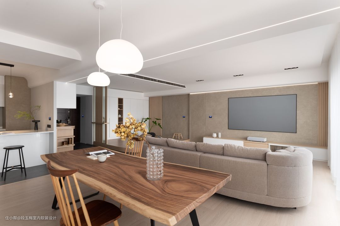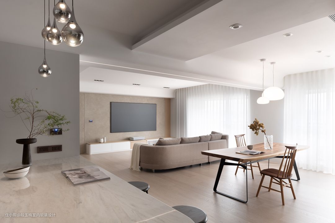 地面:采用369地板通铺,温润的质感便于孩子在上面活动。 吊顶:采用无主灯设计,简约明亮。 背景墙:电视背景墙采用清水砼,肌理感和花纹都非常的好看。 人性化设计:客厅采用无茶几设计,所有家具低矮还做了圆角处理,设计师时刻考虑孩子的成长。