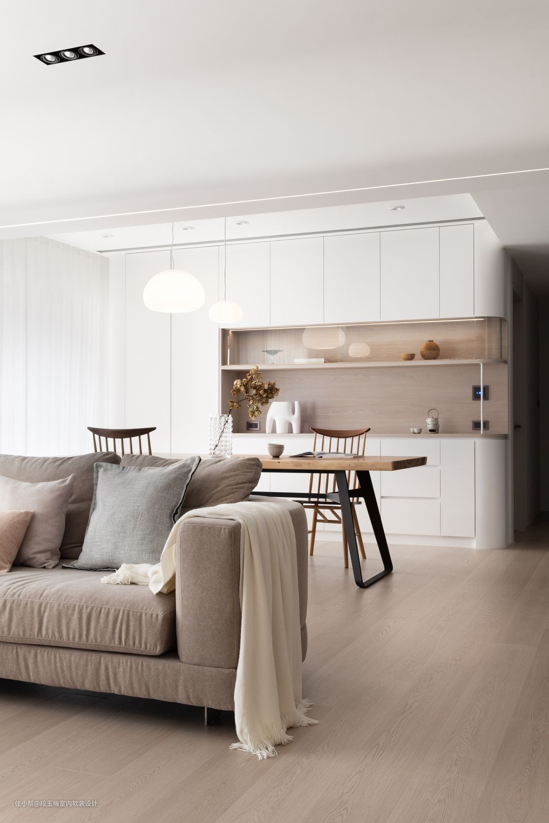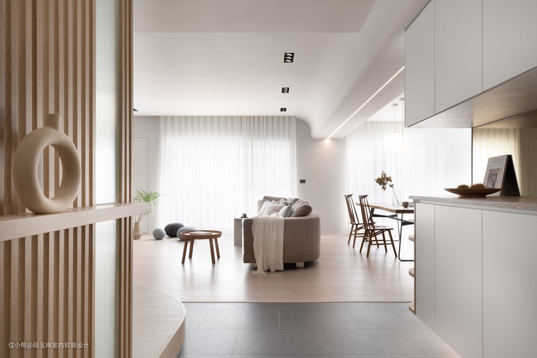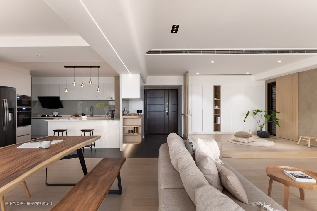 业主是一家五口,父母以前会经常出差住酒店,所以希望新房能温馨不要太商务。三个孩子,9岁、6岁的两个女儿和一个呱呱坠地的男孩。 改造前: 1. 房屋缺乏对三个不同年龄孩子的生活规划; 2. 封闭式厨房没有采光。 改造后: 1. 空间布局:拆除公共空间的墙体,让整个空间充分接受采光。 2. 设计调性:风格以白+木为主色,以灰色为配色,温馨自然,适宜孩子成长。 3. 功能性问题解决方案:将厨房改成开放式厨房+岛台的形式增加采光,儿童房采用上下床,给孩子更多的活动空间。 4. 设计亮点:设计了儿童活动区,满足孩子玩耍、阅读的需求。