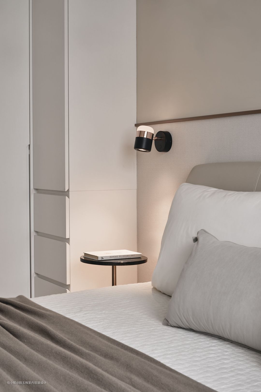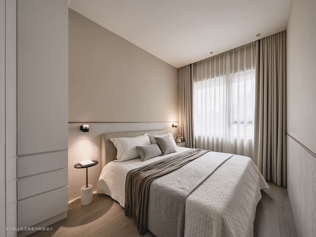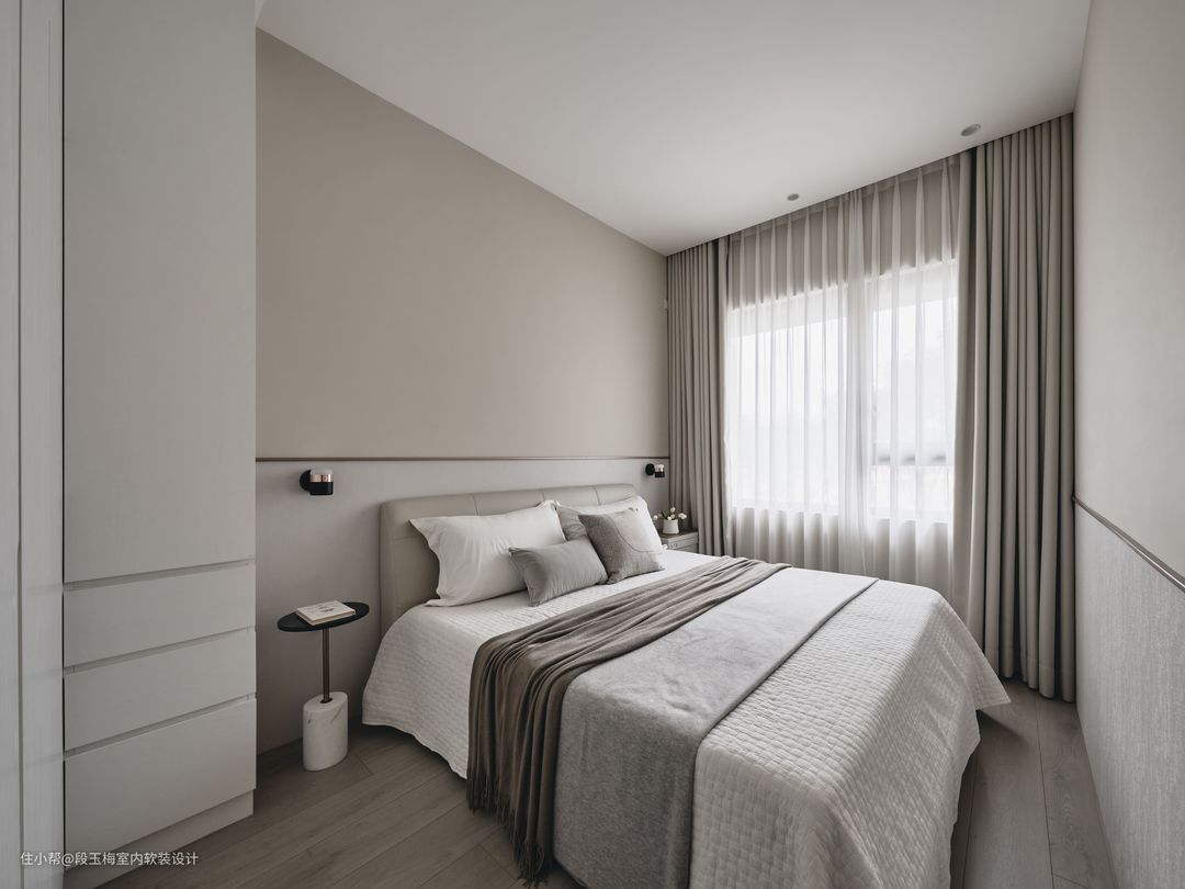 背景墙:采用双色壁布拼接,两盏轻奢壁灯既实用又美观。 人性化设计:设计师利用门口空隙设计了妆台,化妆凳可以很好的收纳在妆台下。