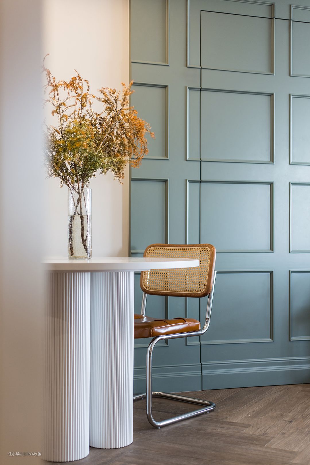 餐桌旁边的护墙板由餐厅起到客厅终。低饱和度的蓝绿混合色,很稳重,很耐看。一进门就会把人的视线引到这边,从而忽略房子的异形结构。