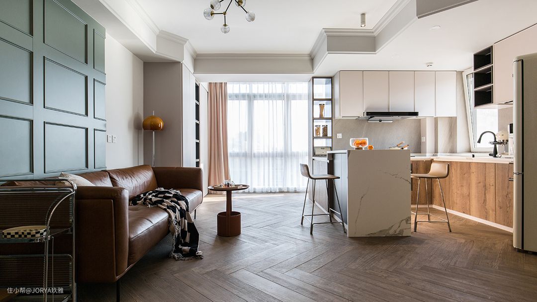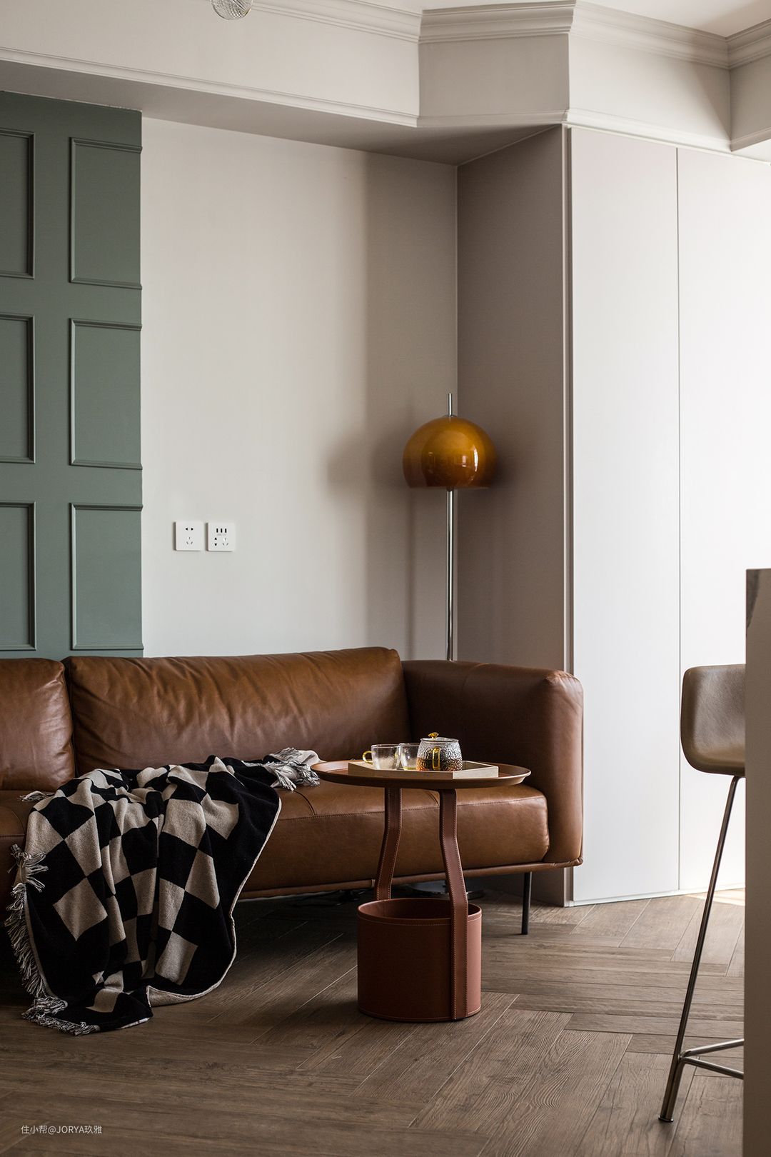 护墙板的矩形装饰框,真皮橘色沙发,人字拼“木质”地板,这些都透露着传统美式元素。护墙板还“兼顾”着隐藏主卧门的职责。