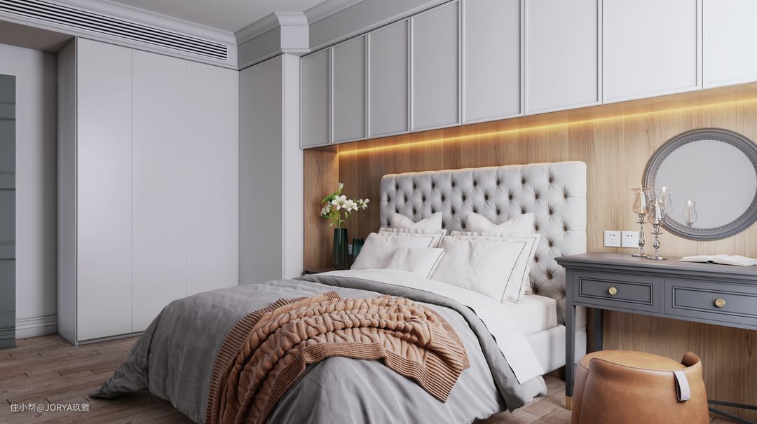 主卧为了增加储物空间,衣柜从进门开始一直延伸到窗边。床头上为吊柜,为了不造成压迫感,吊柜厚度缩小为45公分(落地衣柜为60公分)。