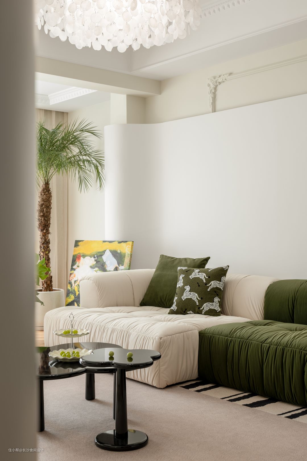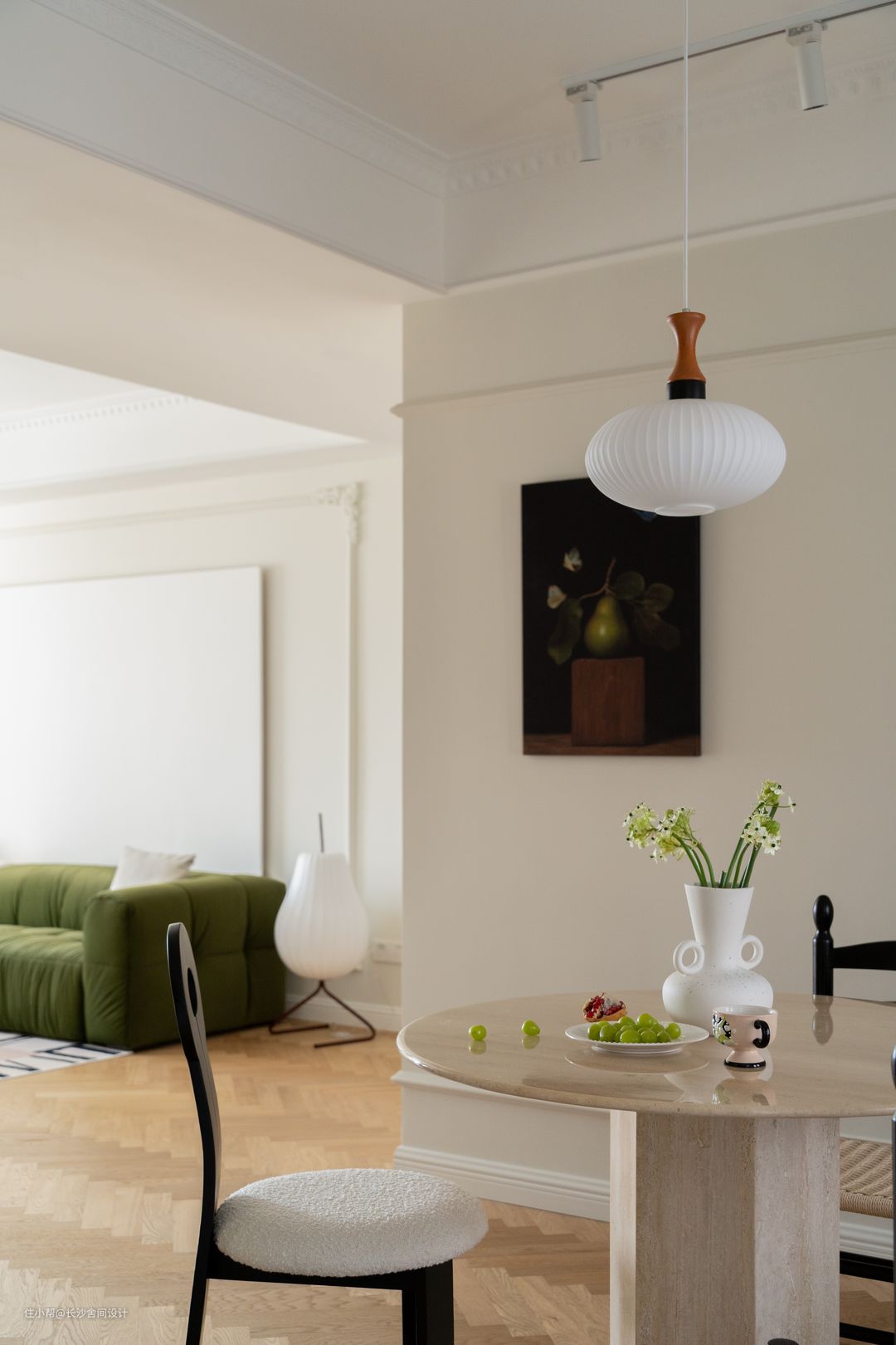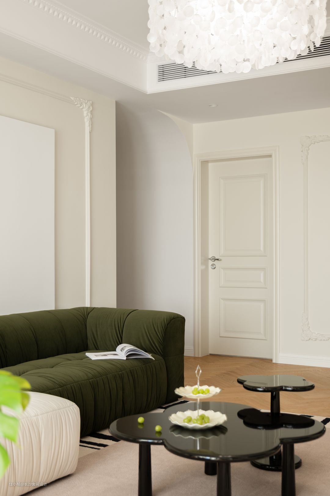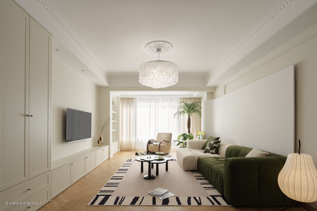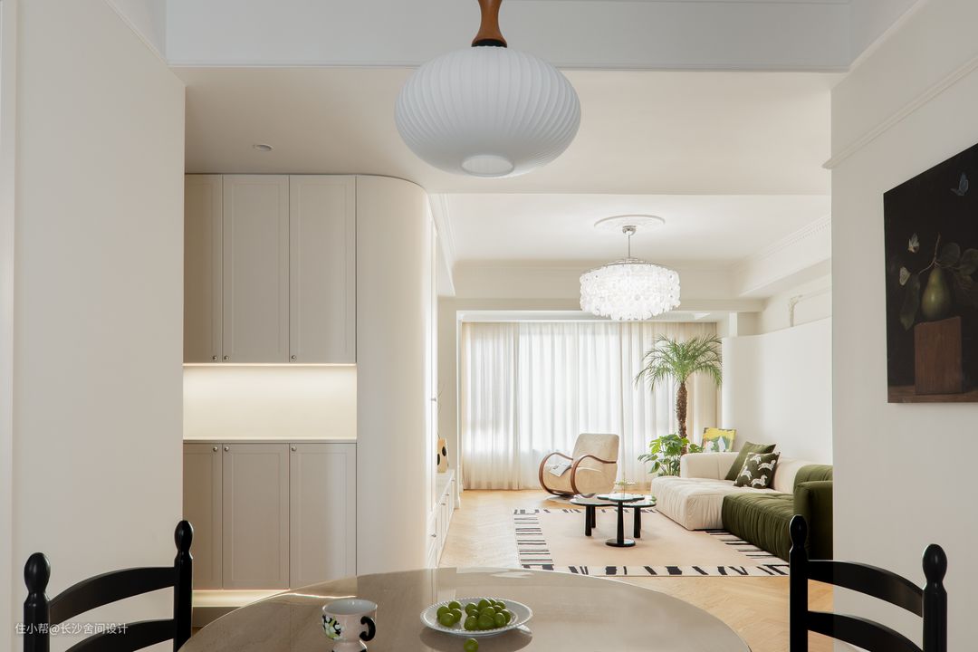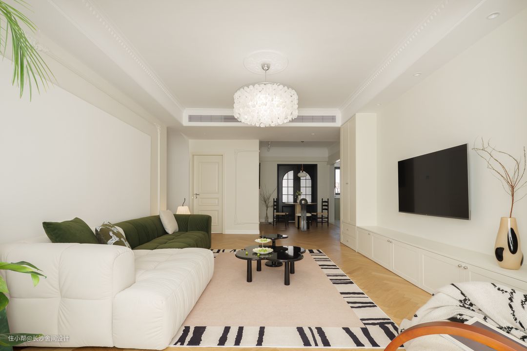 客厅看向餐厅视角 大面积保留原顶的客厅空间,局部边顶+石膏线造型恰到好处地为“法式风”注入灵魂,又不会影响层高,一奶白一绿色组合型沙发,和整体空间是非常契合的