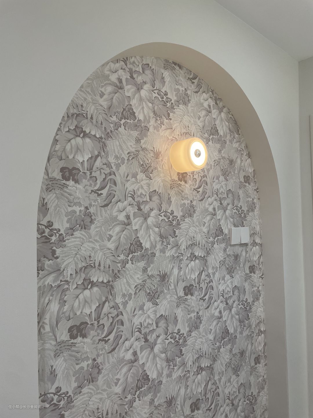 在玄关右边的墙体,凸出来一点点承重墙,弧形+壁纸成为玄关的一个端景,玄关也是一个超大的全身镜子,拍照绝好的地方