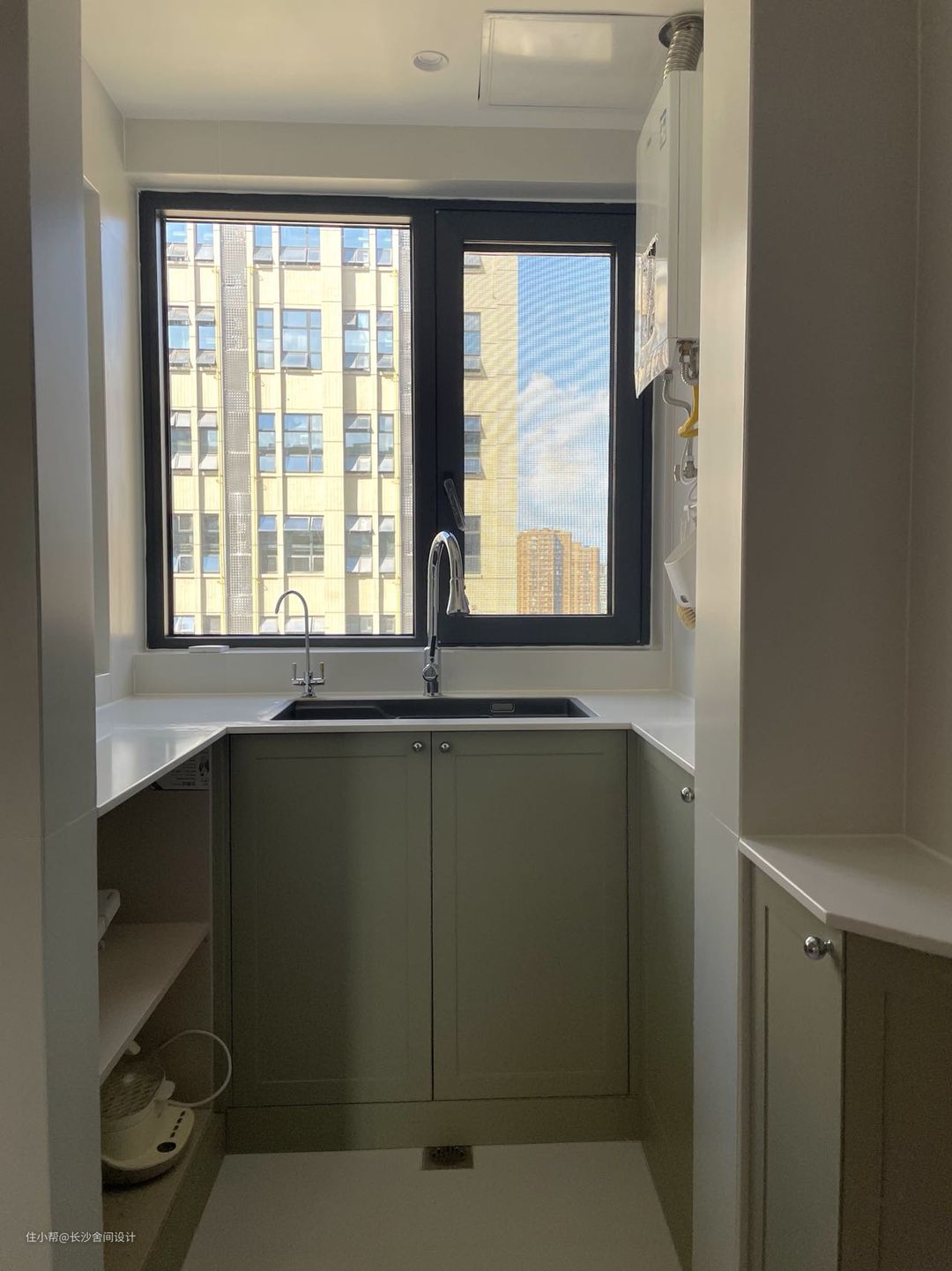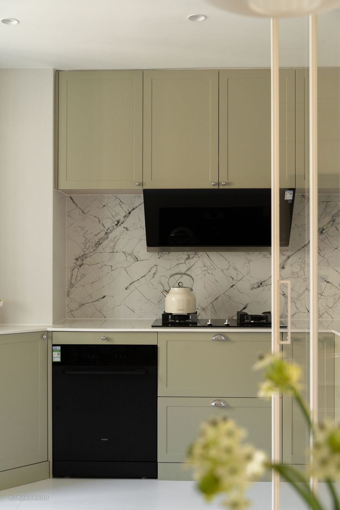 原本厨房不大,连接厨房处刚好是有一个外机位的,整体进行打通,把洗菜池设计到这块区域,还增加开放式储物架和茶水吧空间 打通后是有两个直角的,为了弱化直角设计斜柜,入嵌洗碗机让空间更加整洁,厨房绿色柜门+银色法式拉手,隐形三联动厨房门,做饭的时候拉上,不做饭时候打开,不影响空间开阔感