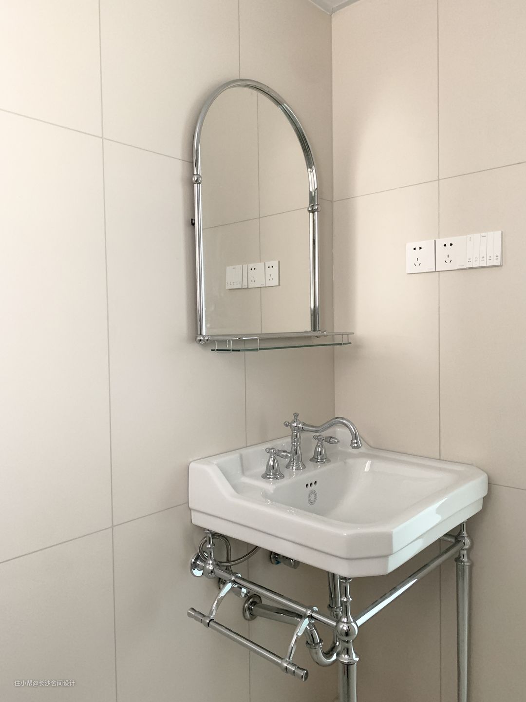 卫生间是比较小的,细长的腿,让空间不拥挤,一体盆搭配金属元素,镜子也是金属外框,相呼应统一性,镜子上是有一个小台面的,用来放置一些日用品