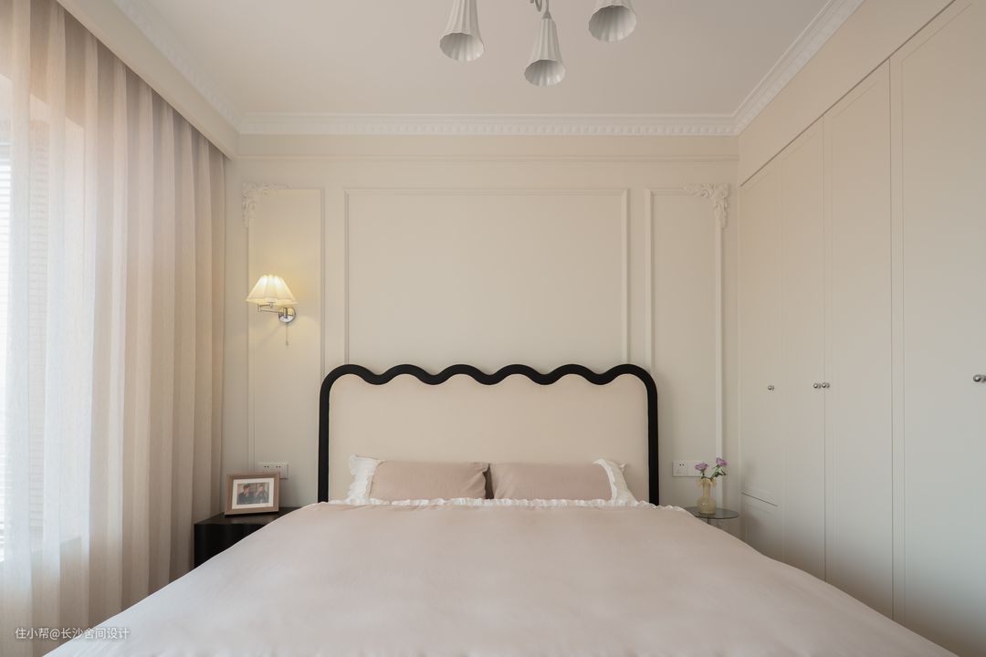 加高软包床带着让人沉沦的温柔感,躺下褪去一身疲惫,周围不断溢出慵懒的香气。背景墙没有添置复杂的装饰,只用法式石膏线做成了整体背景墙,一侧设计壁灯,夜晚打开灯,高级感拉满