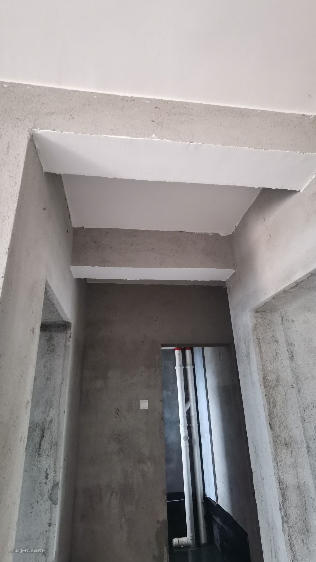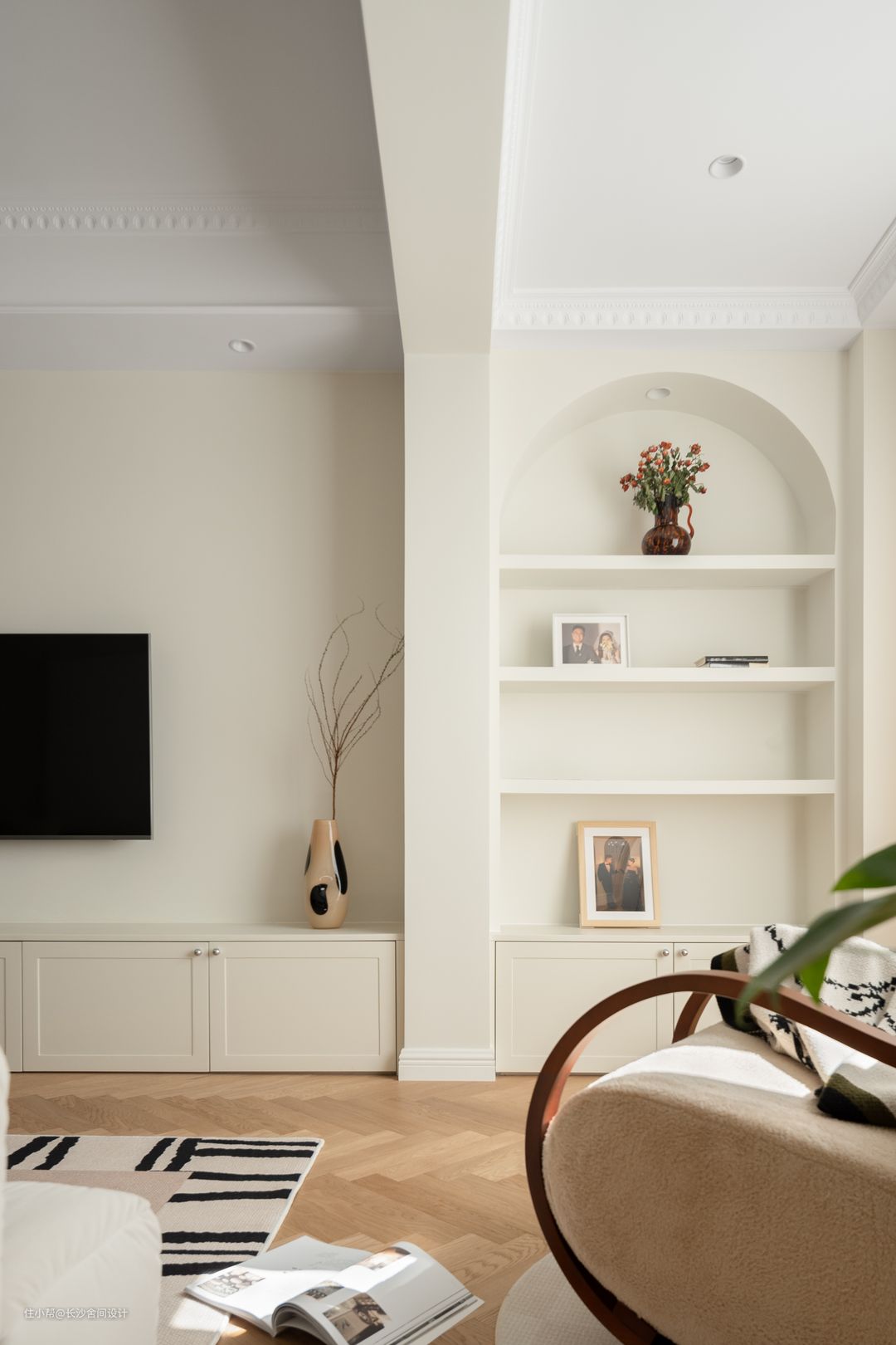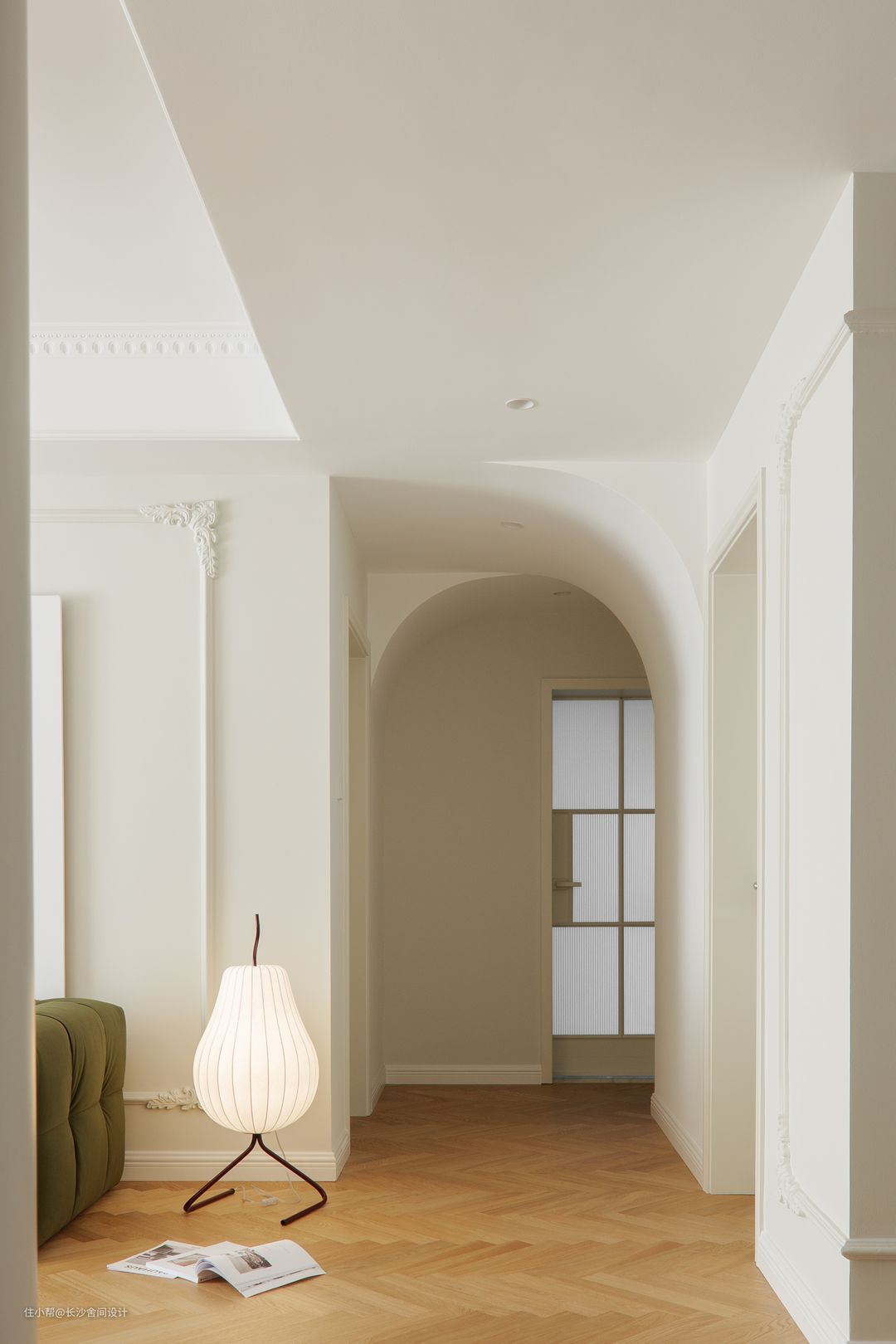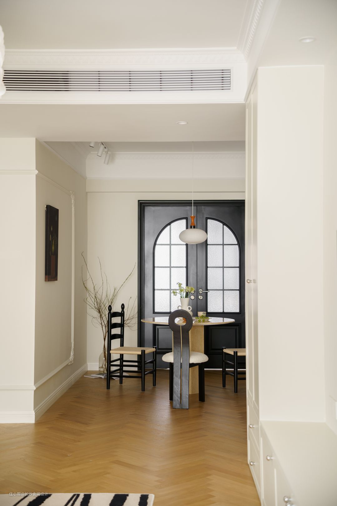 走廊是有两根梁的,太过于生硬,不太适合轻法式风格,利用这两根梁,做成两个半弧形设计,让空间视觉感柔和,成为一进门适合的端景,也弱化卫生间门在空间的视觉感