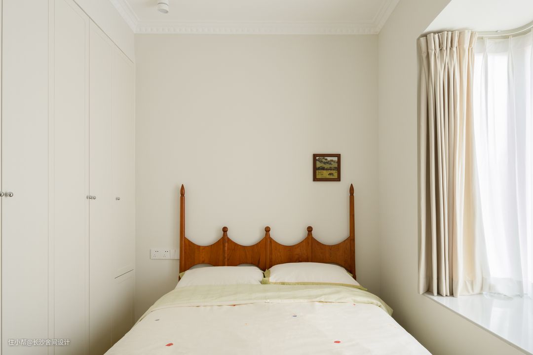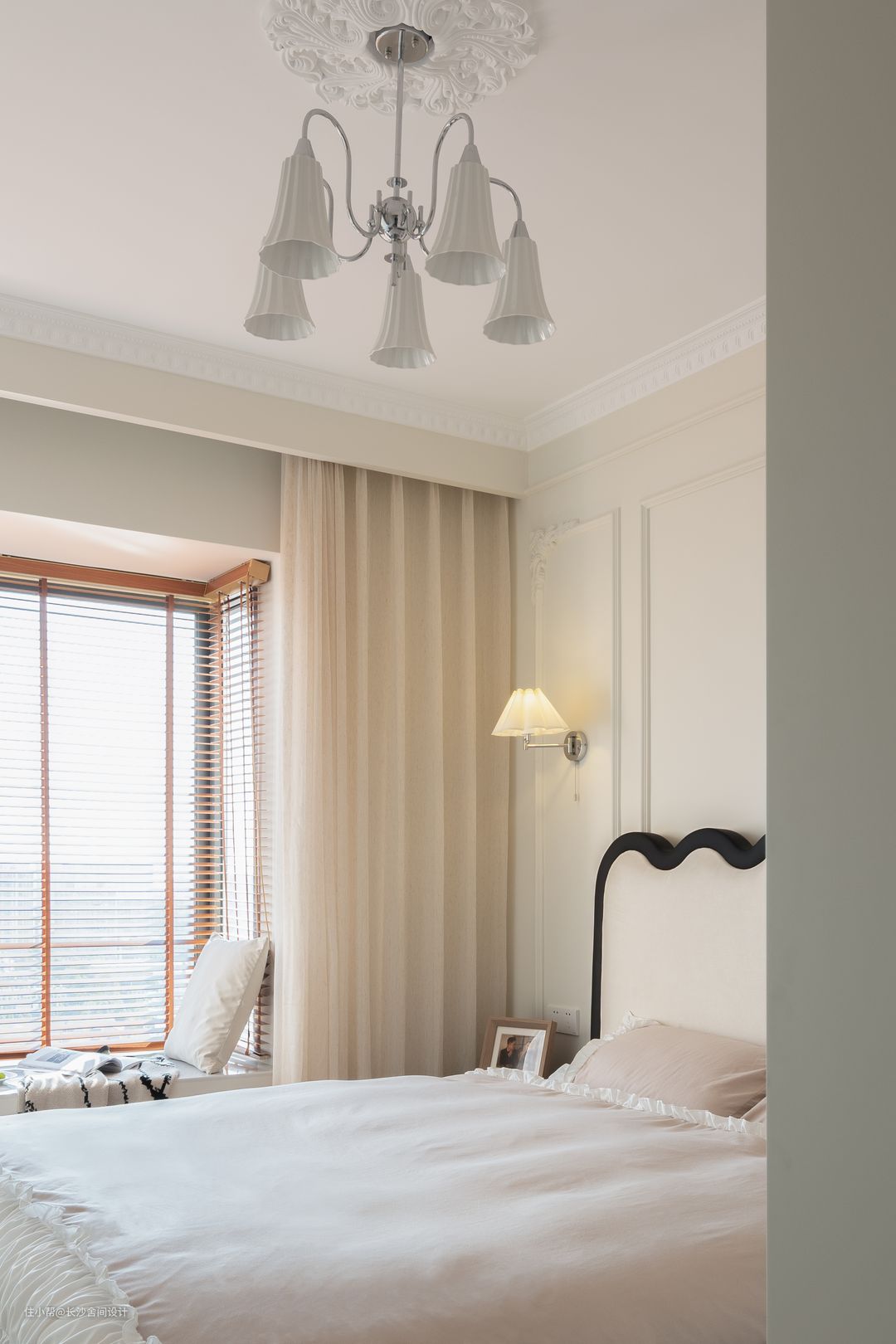 主卧墙漆颜色是和客厅统一的,吊灯作为主要灯源,卧室遮光采用木百叶+纱的形式