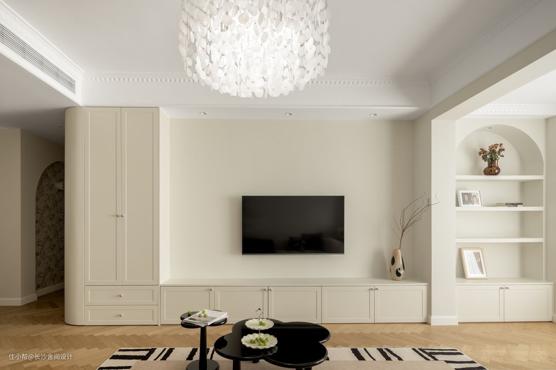 电视背景墙简单奶油墙漆+柜子的整体形式,鞋柜与储物柜利用弧形两者连接,更加地柔和空间,矮柜立地方便打扫卫生,墙面与顶面用颜色区分开来,增加视觉的层次感