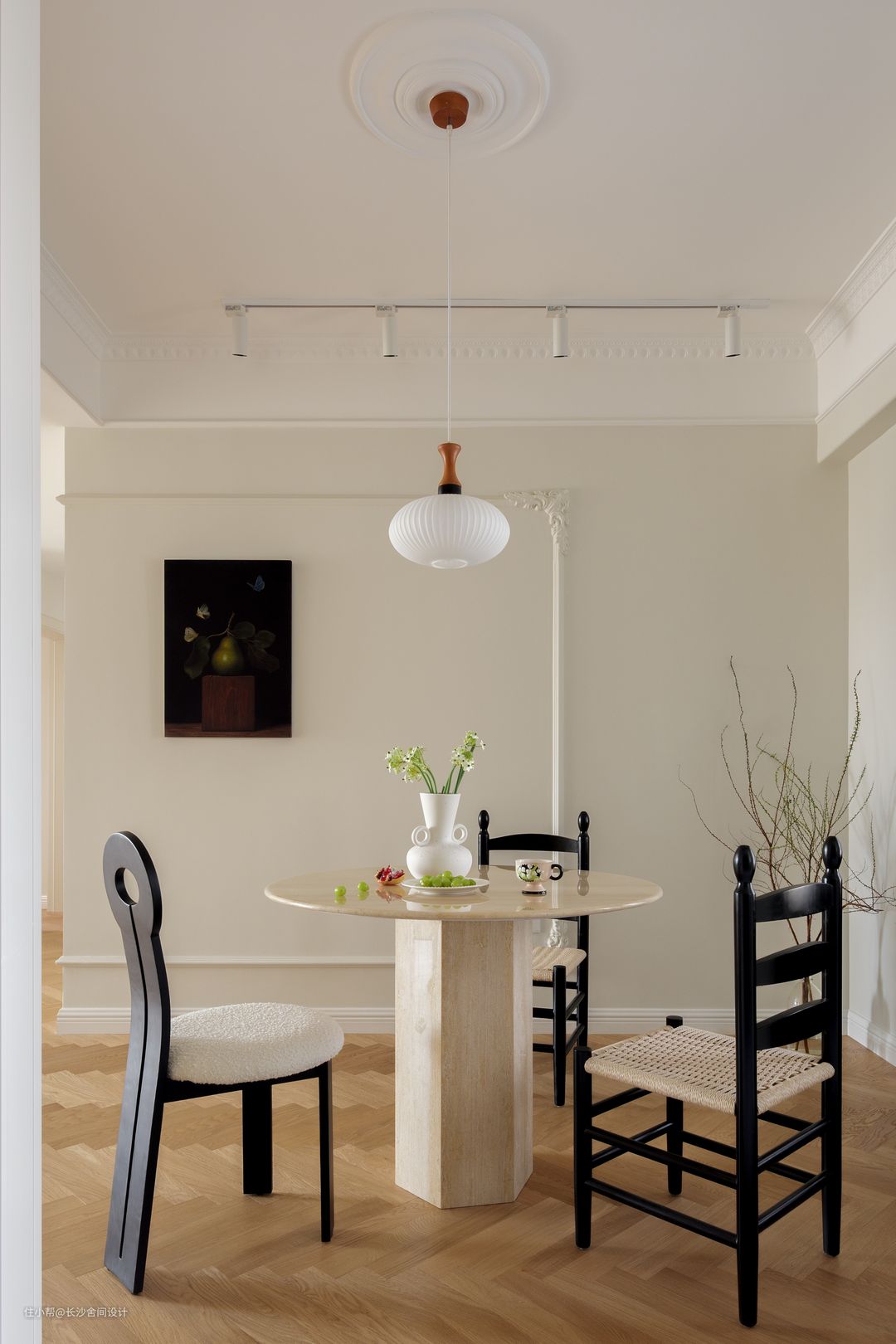 黑色餐椅与墙面的装饰画相得益彰,让这一块成为入户过来就能看到的场景,法式石膏线的搭配,无一不透露出屋主的法式浪漫情调 ,顶上明装射灯灯源洒落下来