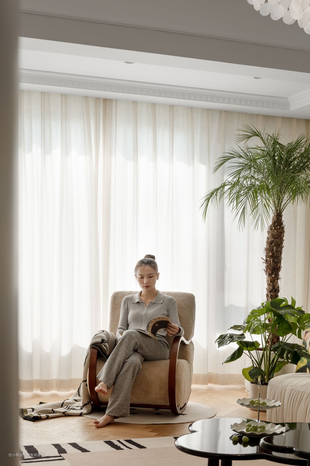 沙发背景的弧形刚好也能增加了植物角,在窗边打造出整体休闲的效果,阳光透光纱洒落进来,坐在摇摇上看书,绿植包围起来,一副岁月正好的感觉