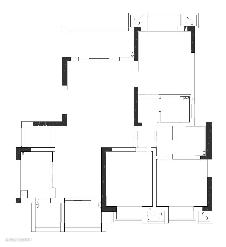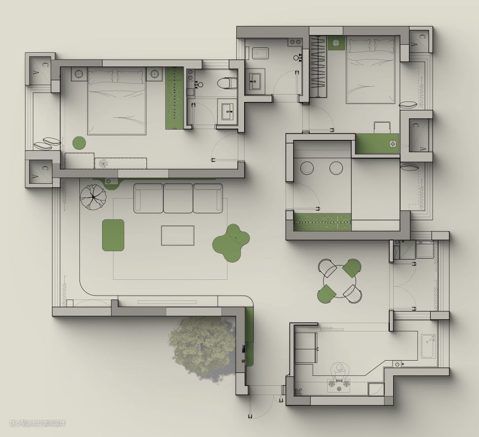平面改造:三室两厅两卫一生活阳台 1、入户做的260mm薄鞋柜,同时增加超大异形镜子,方便出门的时候整理仪态,也能增加入户玄关的延伸性 2、鞋柜与客厅储物柜连接处,利用弧形柜让整体视觉感更好,同时也增大了储物的空间 3、客厅与阳台进行打通,形成整体客厅效果,原阳台的水管用弧形包起来并延伸过去,形成整体沙发背景墙效果,同时也新增了植物角 4、厨房与空调外机位进行打通,打通之后是有两个直角的,设计斜柜,弱化直角视觉感 5、考虑后期会生宝宝,所以在空间的改造上我们还是保留三房空间,次卧和书房做了灵活的处理设计,随着后期需求,房间都可以随意变换功能