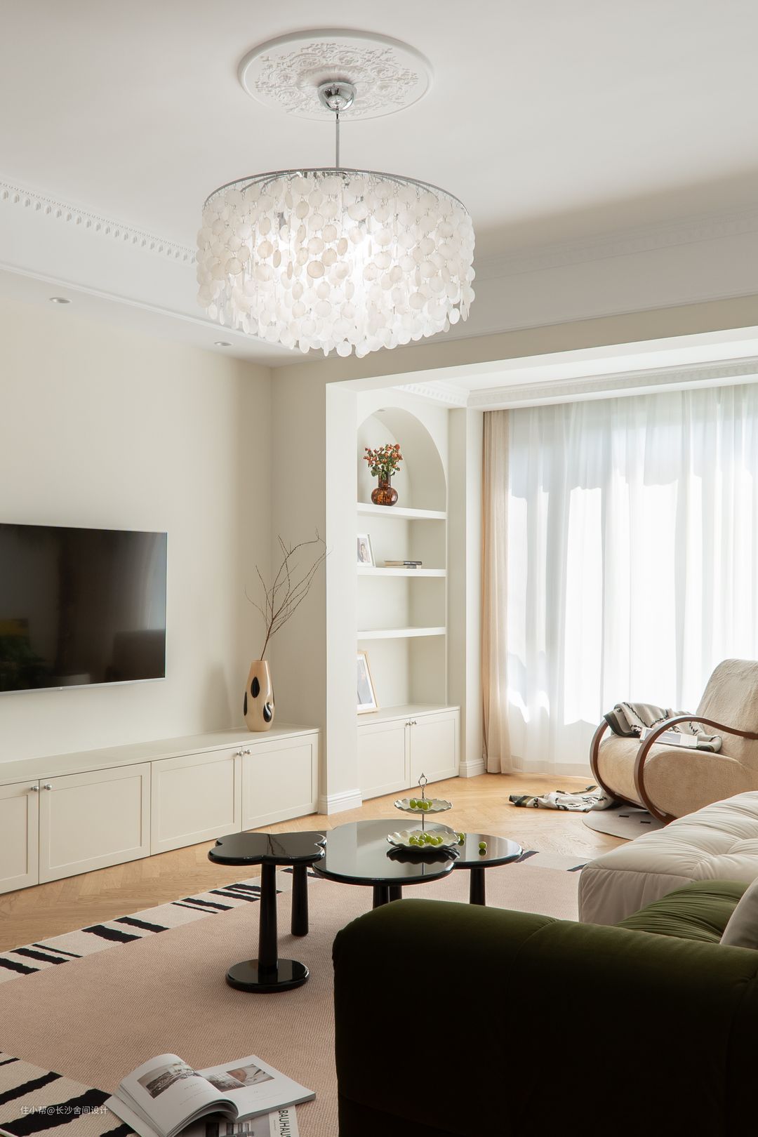 贝壳吊灯作为客厅主要的灯源,风一吹过,一串串的贝壳伴着风会发出清脆的声音,灯是好看的,就是比较费手的,设计师串了3个小时才弄好