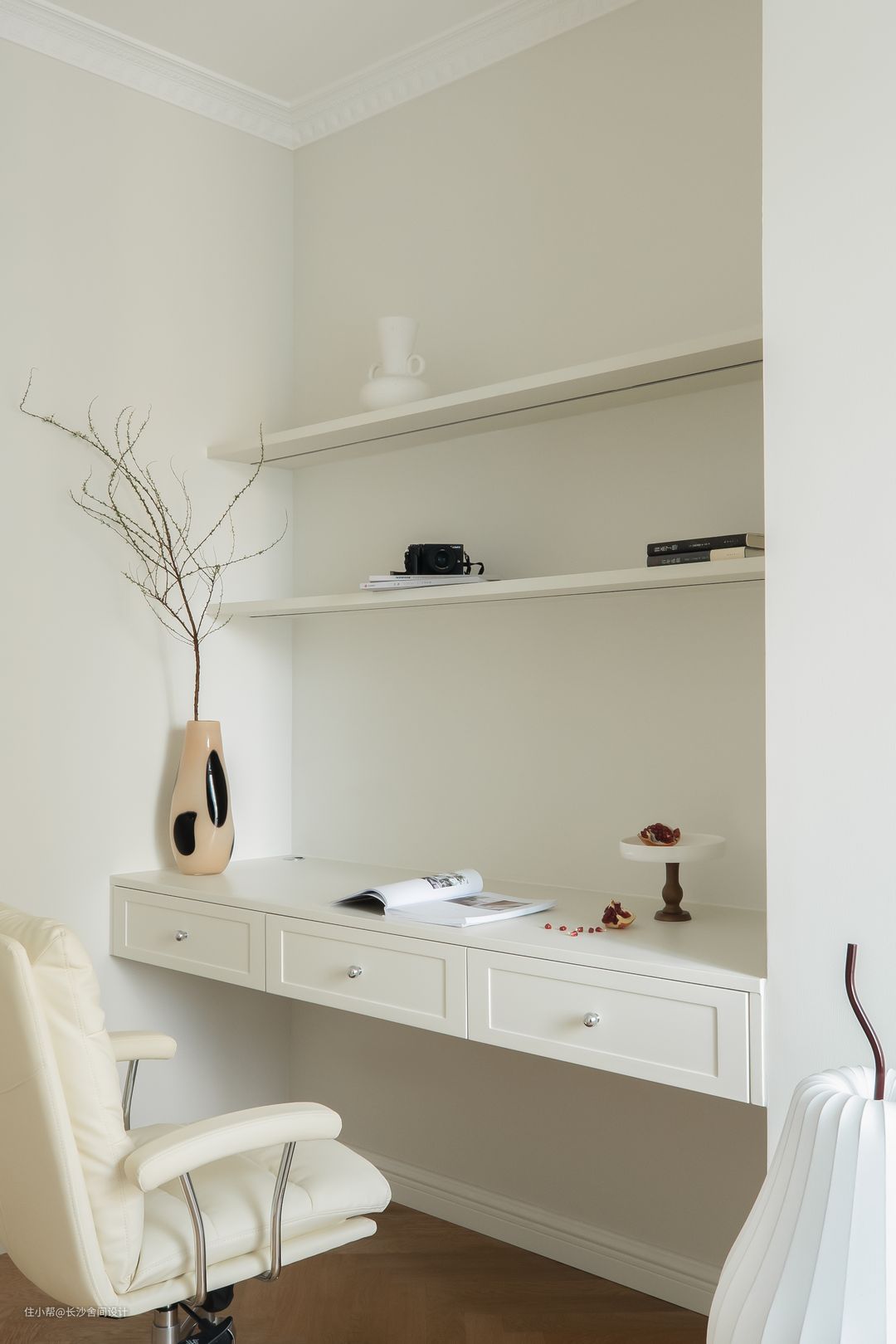书房后期也可以添加成品榻榻米,书房兼客房使用,悬浮储物柜兼办公台,两层层板可以当作展示区也可以当作书架进行使用