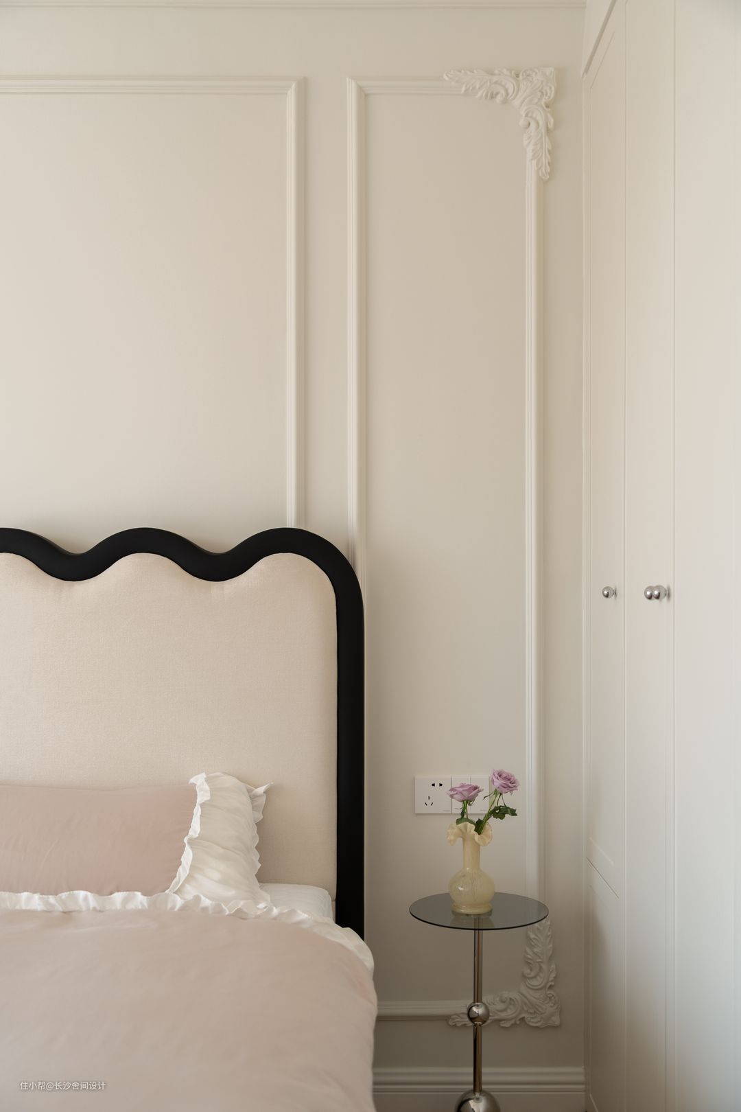 因为空间不是很大,衣柜没有做过多的造型,纯柜门又会显得过于朴素与整体格调不搭,银色金属点缀在柜门上,让空间多了一些灵动性 法式细跟边几,让空间显得不压抑,为了防止打不开柜门,做了上半部分打开柜门,不会影响使用