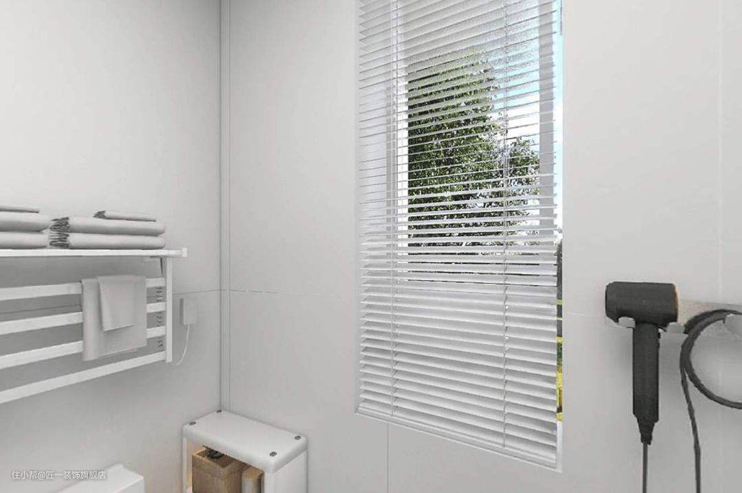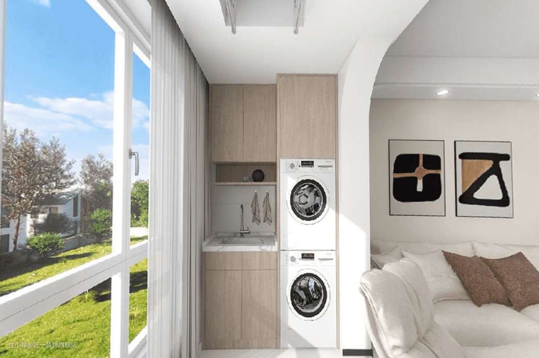 阳台打通垭口做圆弧处理,没有90度直角的顿感,很好的体现出了曲线本身的流动美。生活阳台放洗衣机柜等物品。
