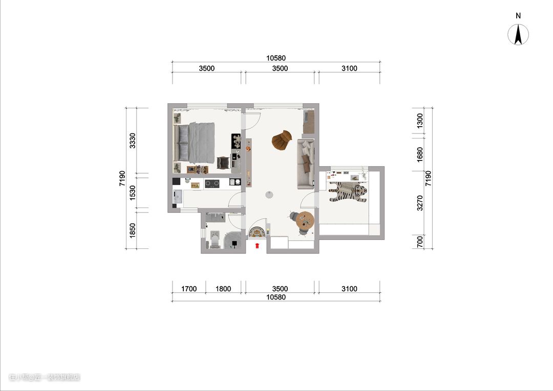 虽然客厅的面积比较小,但是地面选用750*1500的奶油色哑光砖,体现出空间的柔和感,减少瓷砖的冰冷,更加突出温馨自然,黑白格毛绒地毯增加视觉延伸感。 电视背景墙以简约素雅为主,不做过多的装饰,奶咖色乳胶漆,吸顶灯承包客厅的采光。