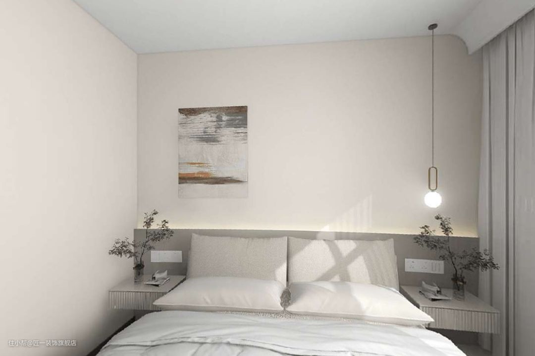 卧室也是采用米色系进行搭配,可可淡奶乳胶漆+木饰面作为床头背景,凹槽处留灯带,床头两个对称的悬空床头,卧室没有做衣柜,让卧室更加宽敞。