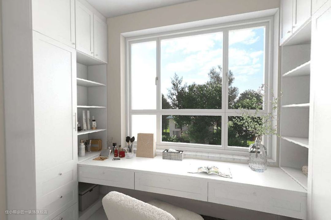 女主人最爱的白色系衣帽间,白色在视觉上会给人一种空间放大的效果,对小户型十分友好,米白色柜门干净整洁。