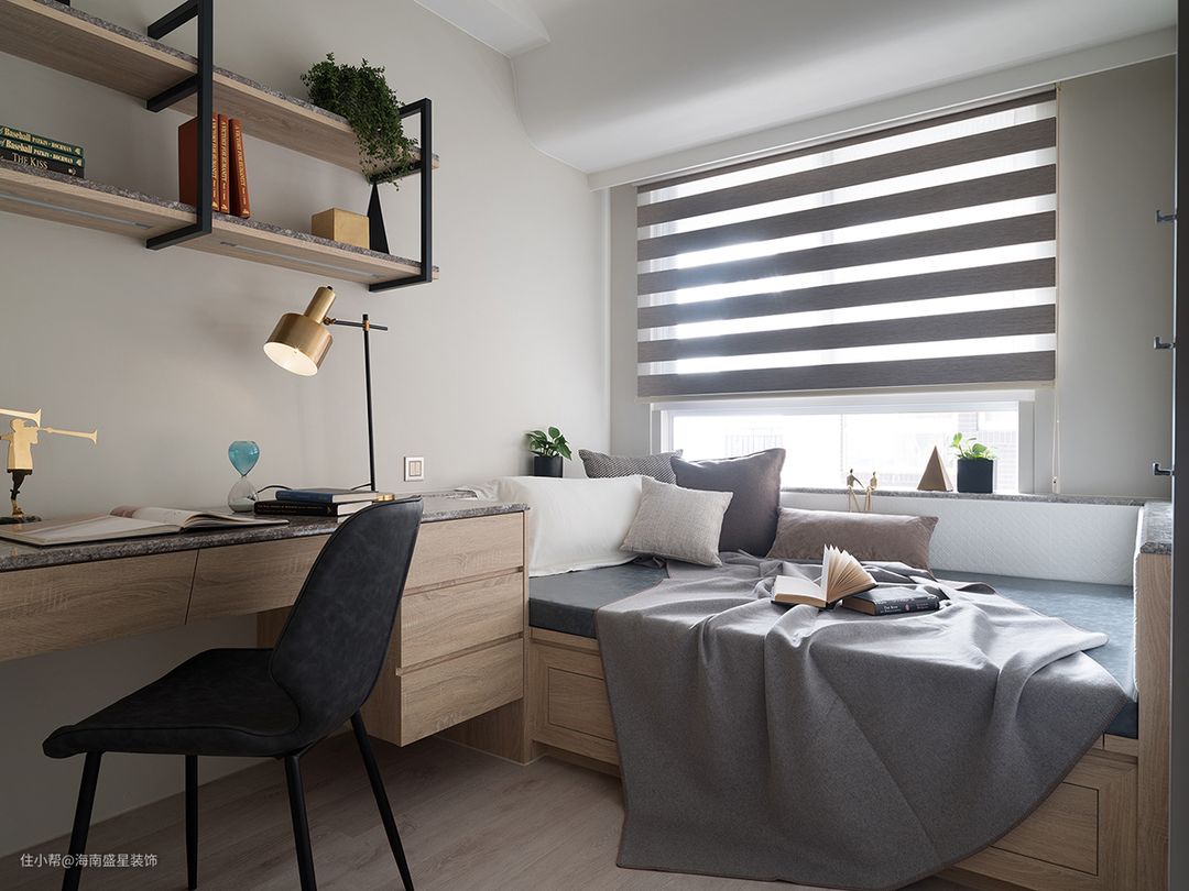 当躺坐在沙发上,一煦日光轻复,映入眼角余光。这道光来自书房。随玻璃格子门穿引入室,串连了视线与互动。 书房肩负着多功能室设定,除了日常当作工作区外,此房也具备客房定位,于是在滑门处搭配了卷帘,给予留宿者适切隐私,同步于窗边推出单人床,更于四周靠墙处增加柔软靠背,使之兼具阅读卧榻之用,床下更布满了抽屉式收纳,分毫不差地投放着各种情景。