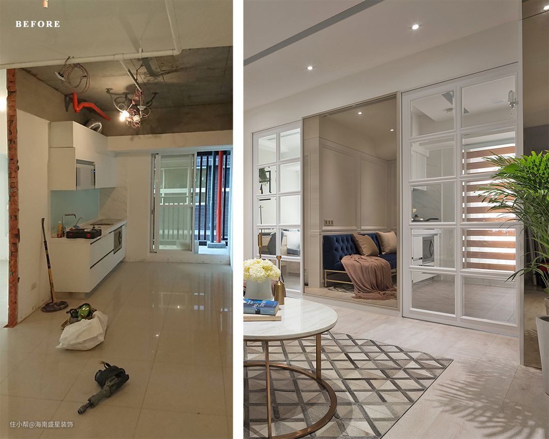 Q:格局安排上,如何引光入室?放大空间感? 本案因应客厅无窗格局,使引光成为改造主轴。我们以玻璃格子门—美式风格经典元素—打开厨房、书房,透过半开放关系延展光线,形成犹如两道窗的通透视野,也在无形中释放了厅区阴暗狭窄的感受,同以一面茶镜取代实墙,巧妙遮挡冰箱量体与厨房台面之余,更以镜面突破封闭视觉,扩大宽敞空间感。 整体格局也在客变后,由原先规划的3房2卫调整为2房1卫。设计师解释:考察居住人数单纯,这回拉掉主卫浴,并将两房并为一房,借此降低走道空间,替主卧争取更宽裕活动范围,同步实现更衣间配。 而更衣间正是利用位落房中央的管道间。藉由多向置入柜体来包覆管道间,齐整出一面电视墙,于后再筑起L字衣柜,靠窗侧也拉开专属女主人的梳妆台,形塑ㄇ字安排,借此预留出窗前一道穿梭光廊。 Q:设计过程中,遇见的困难是?如何解决? 由于屋主非常喜欢新古典风格,然而受限于客厅采光,繁复的装饰性语汇将更显得局促,于是与屋主沟通后,决定取新古典的形,以更简约柔和的现代美式为底,搭配金属雕花框、牡丹花立体画或五金配件与灯饰,并局部佐以象征性古典元素,好比拉扣造型、复古木皮为点缀。既藏有古典式奢华之底蕴,却更贴合现代生活。