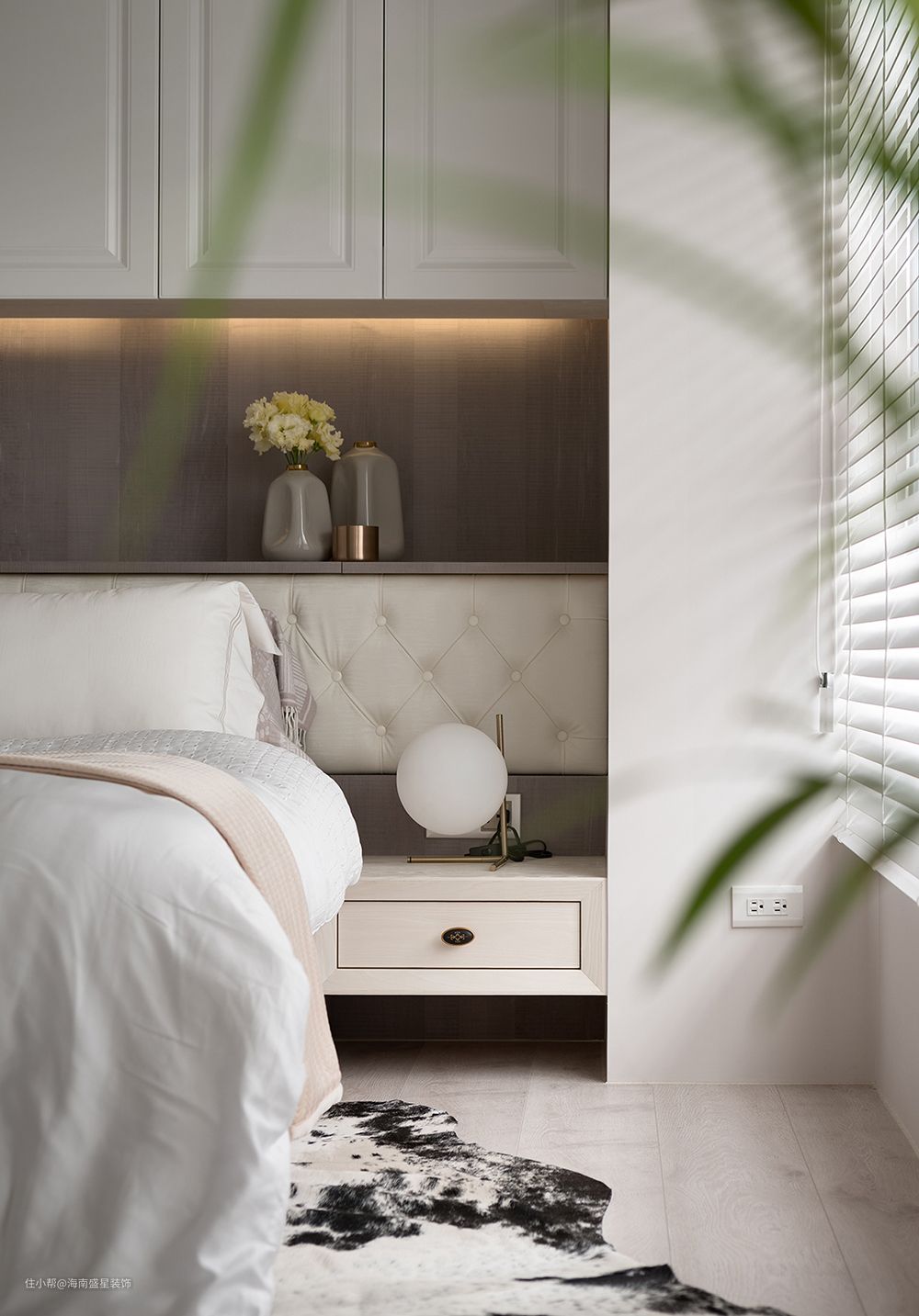 梁压床困境也因此获得了解套,床尾处适足的宽度,让设计师得以利用床头柜填补梁深,灵活化解风水疑虑,更为屋主扩增了储物之处。此外,屋梁处也延续了圆弧修饰,为的是淡化结构体分明的边界,相继伴着菱格纹皮质拉扣、典雅线板与沈稳木皮,交织出举手投足的雅致情怀。